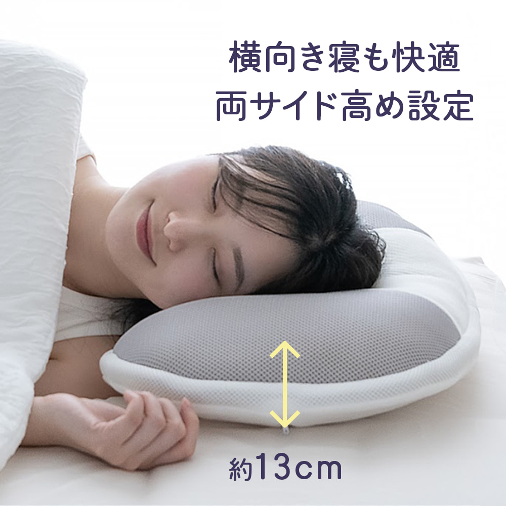 中央部は、くぼみが仰向け時の頭に心地よくフィット。頭部や首筋を安定させるので、安心感のある寝心地をキープします。両サイドは枕中央部より高さを出すことで頭が沈みこみにくく仰向け時は肩を支え、横向き時肩の圧迫を和らげます。