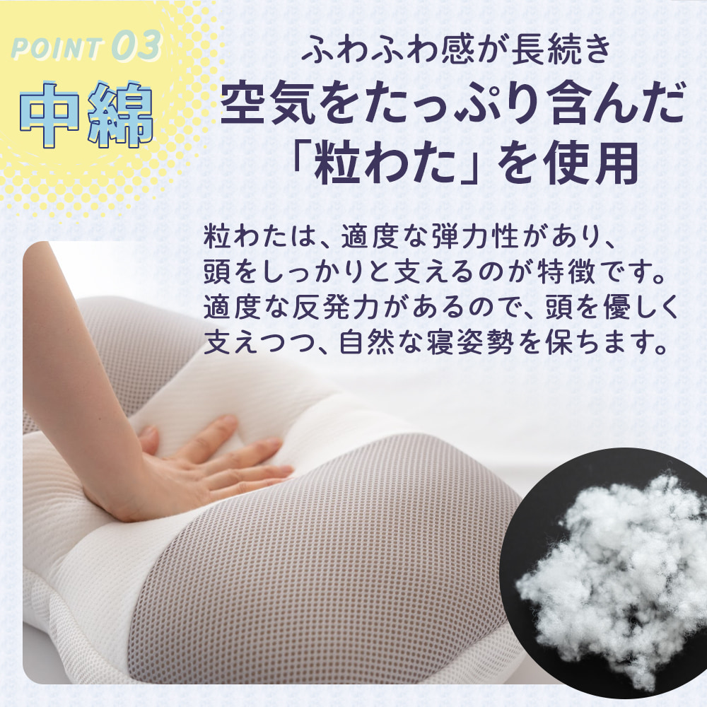 空気をたっぷり含んだ「粒わた」を使用。粒わたは適度な反発力があるので、枕が沈み込まず頭をしっかりと支えるのが特徴です。柔らかい枕が好きだけど、安定した寝心地を求める方にオススメです。