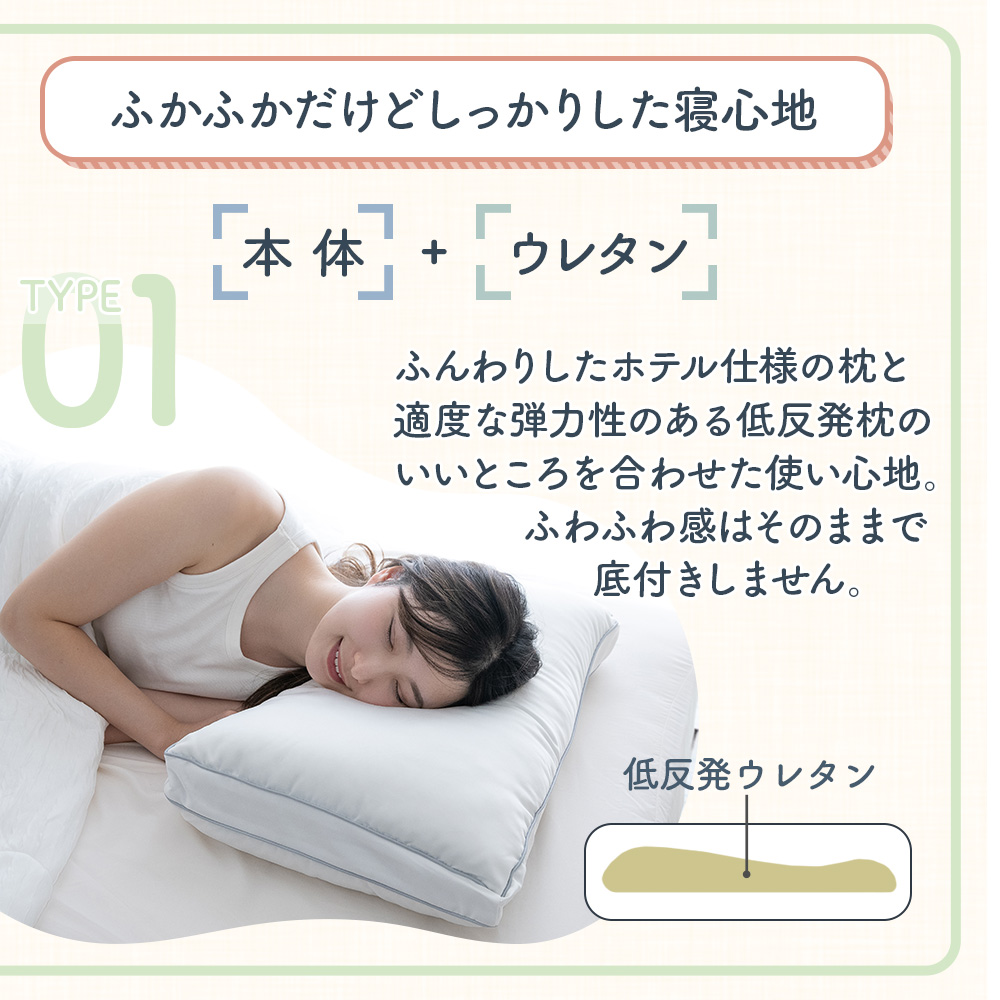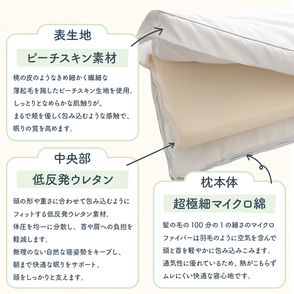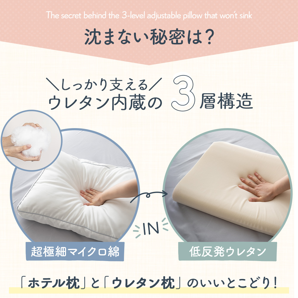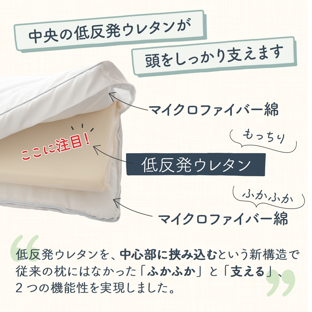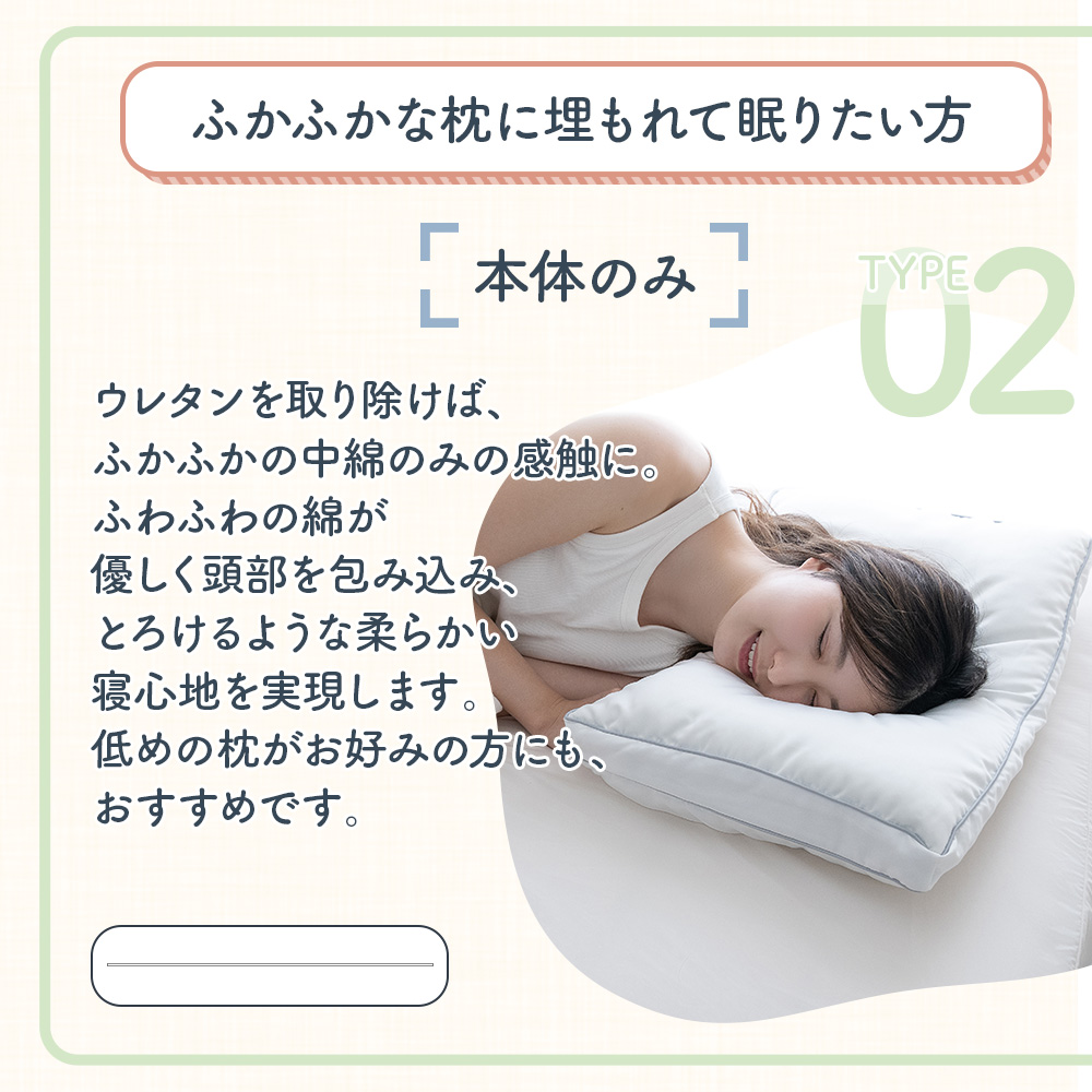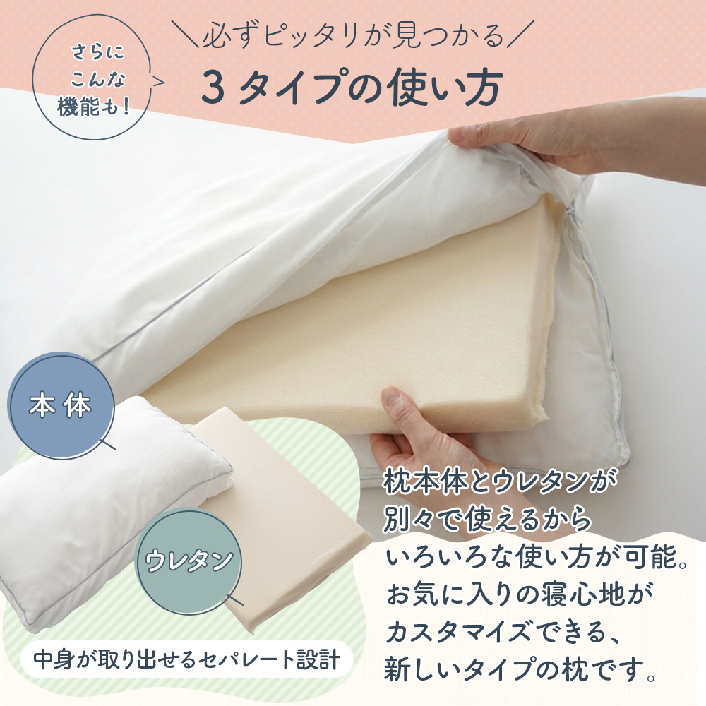 枕本体とウレタンを別々にできるので、いろんな使い方も可能です。柔らかくてちょっと高めが好きな方は、低反発ウレタンを中に入れて、低めでふわふわが好きな方はマイクロファイバーの枕だけで、低めのしっかりした感じが好きな方は低反発ウレタン枕でと、3タイプの寝心地をその日の体調に合わせてベストの寝心地をお選びいただけます。