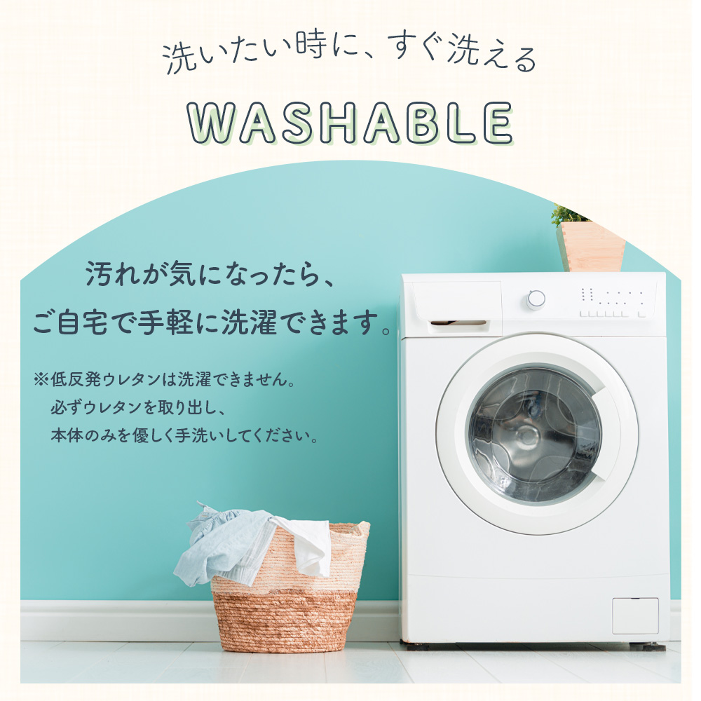 本体、低反発ウレタンともに手洗いができます。洗濯機のご使用は型崩れの原因になりますのでお控えください。