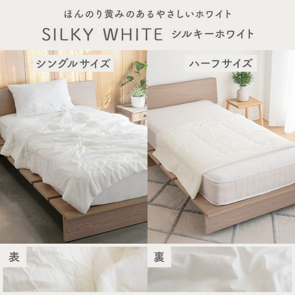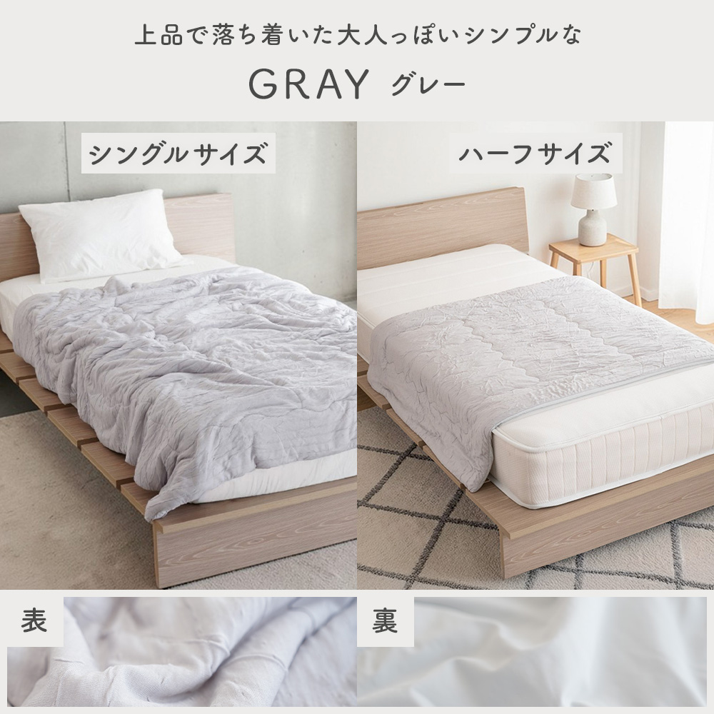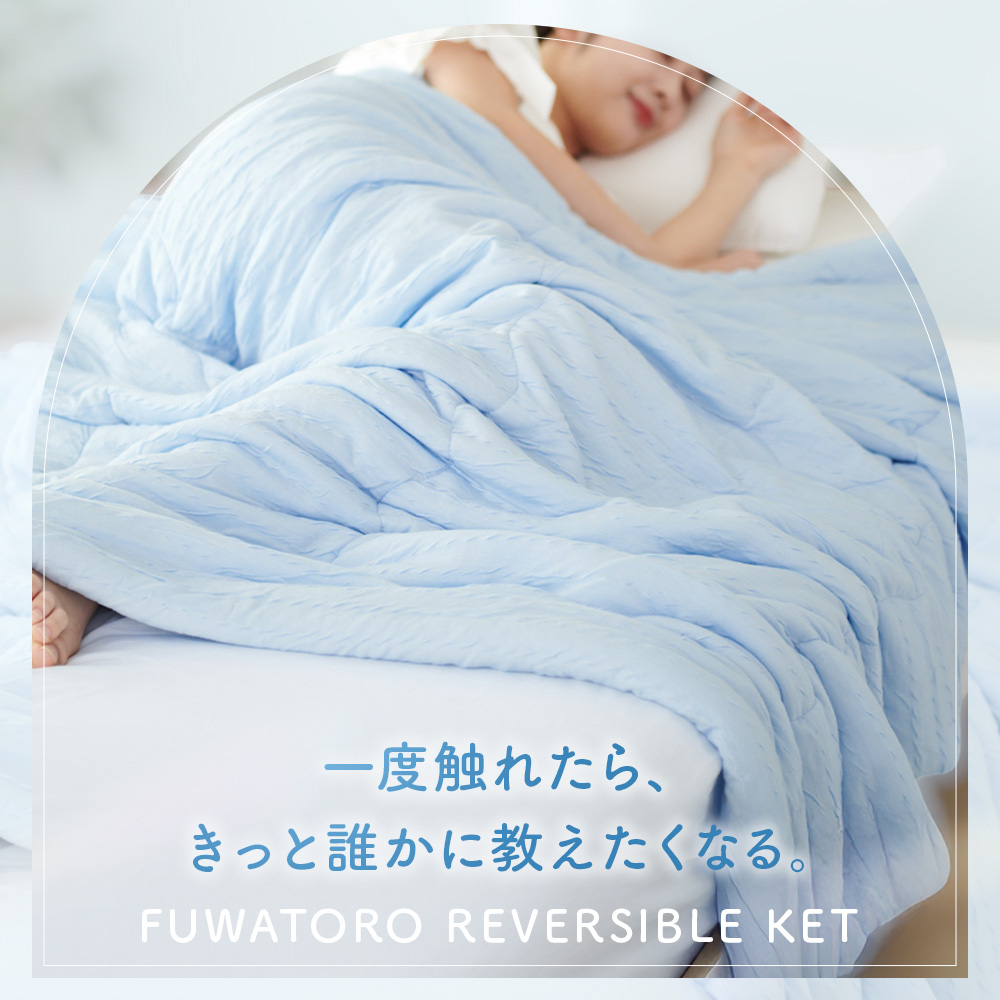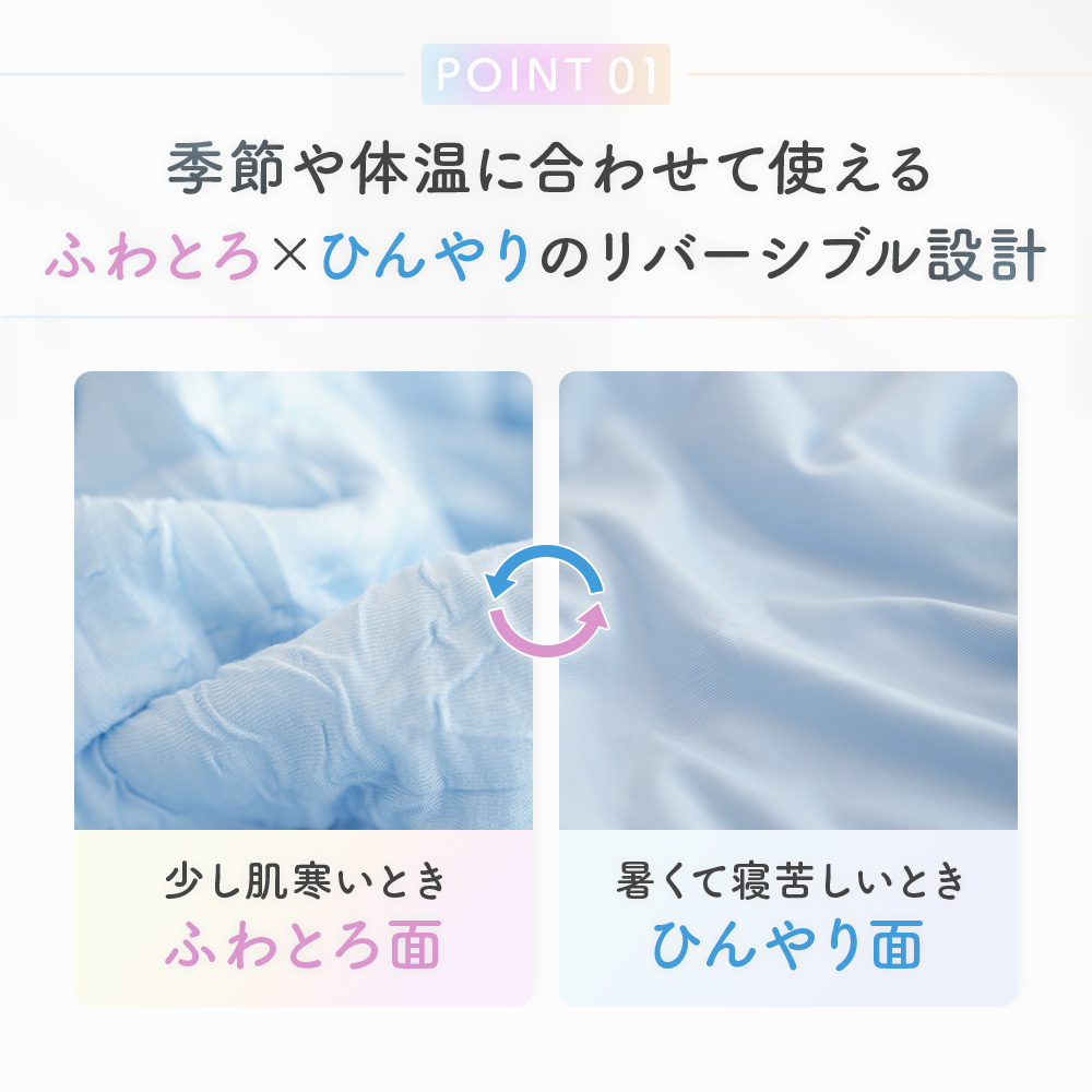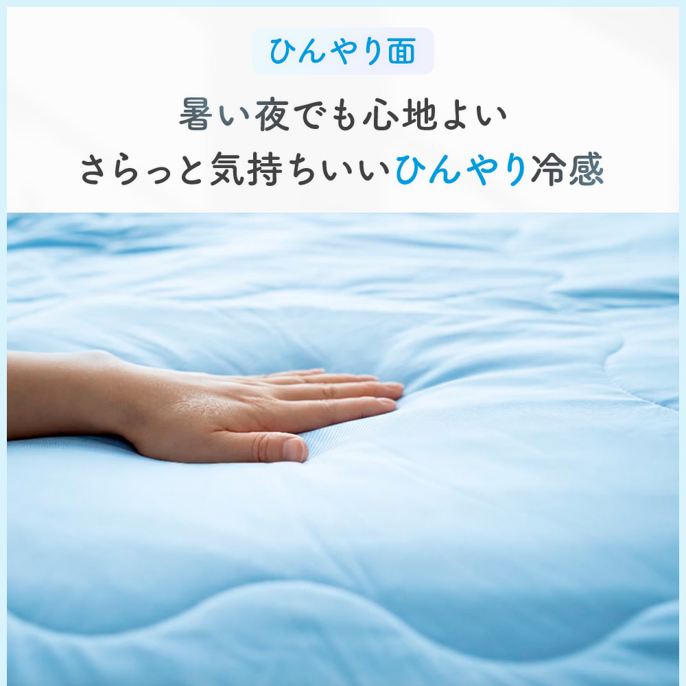シルクのような滑らかな肌触りと上品な光沢感の高級繊維「レーヨン」生地と、モチモチの肌ざわりでふれるとひんやりと冷たく感じる「接触冷感」生地のリバーシブルタイプ。春〜晩夏の睡眠を快適にサポート してくれます。