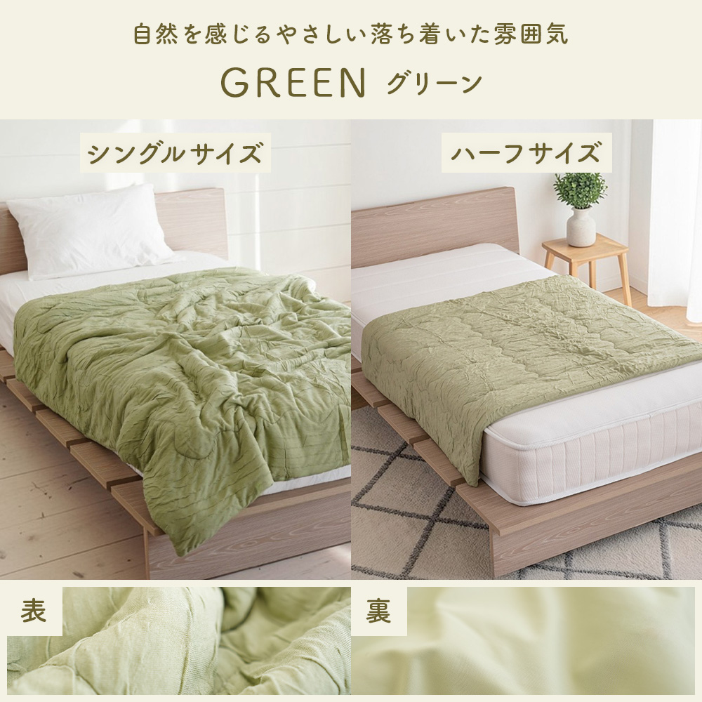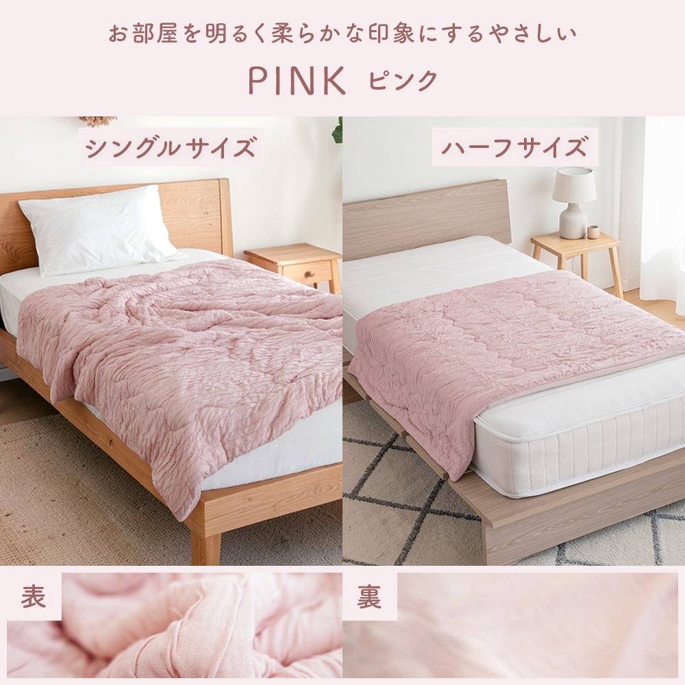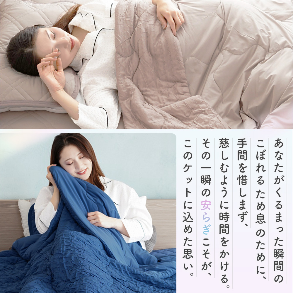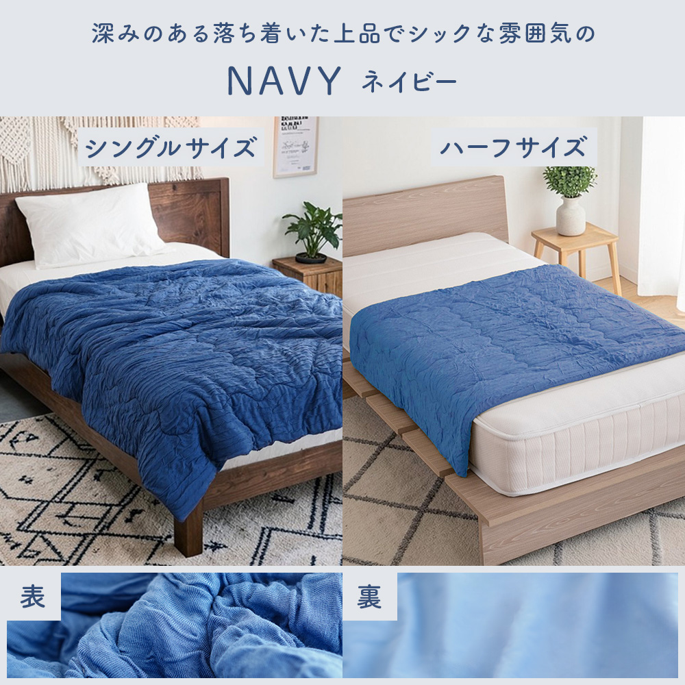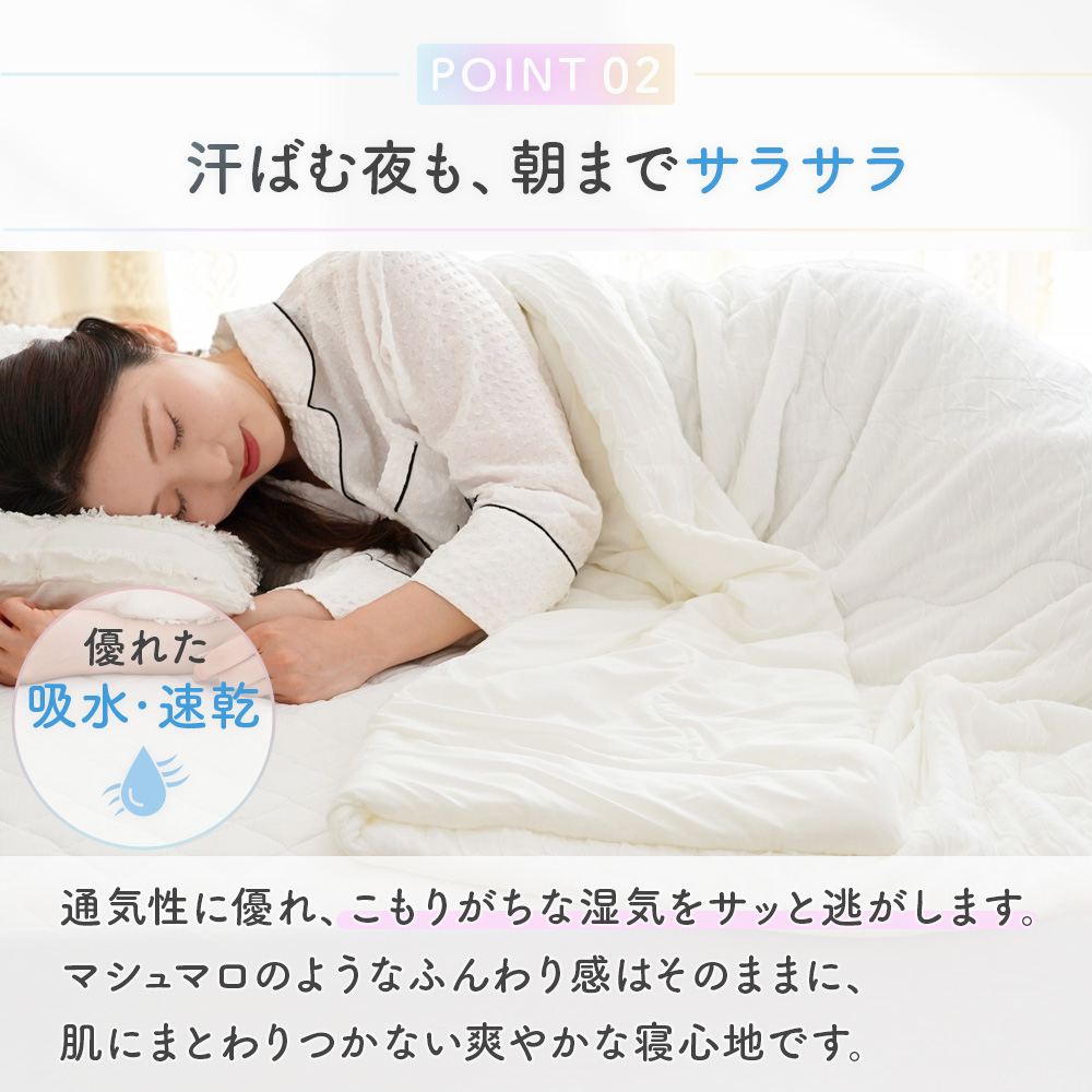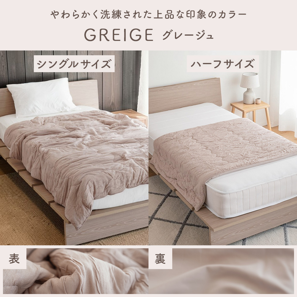 シルクのような滑らかな肌触りと上品な光沢感の高級繊維「レーヨン」生地と、モチモチの肌ざわりでふれるとひんやりと冷たく感じる「接触冷感」生地のリバーシブルタイプ。春〜晩夏の睡眠を快適にサポート してくれます。