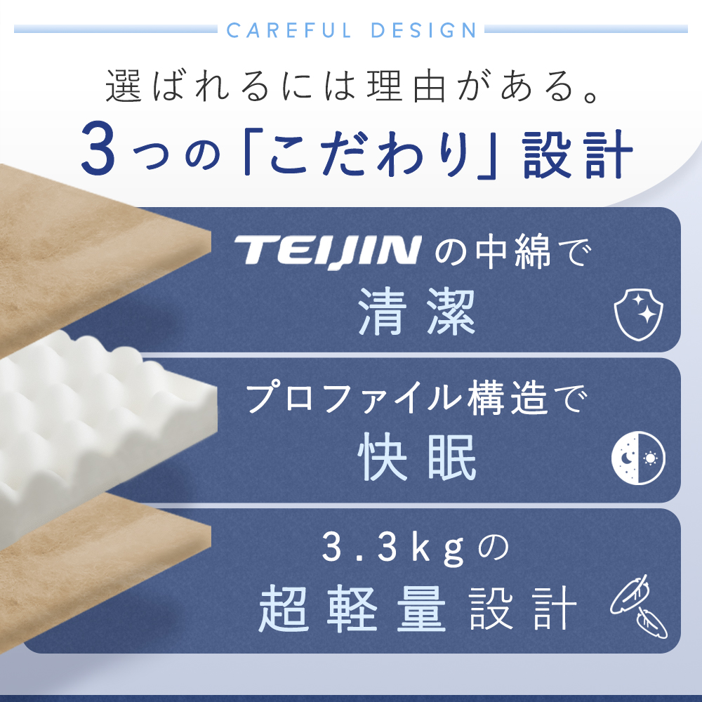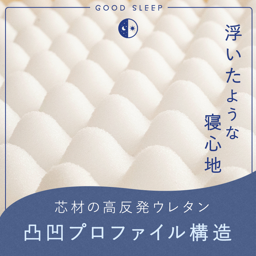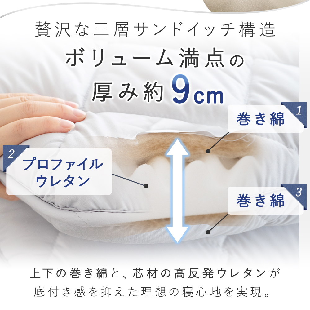 【三層構造で体をしっかり支える】中材は巻き綿と高反発プロファイルウレタンを組み合わせた三層設計。