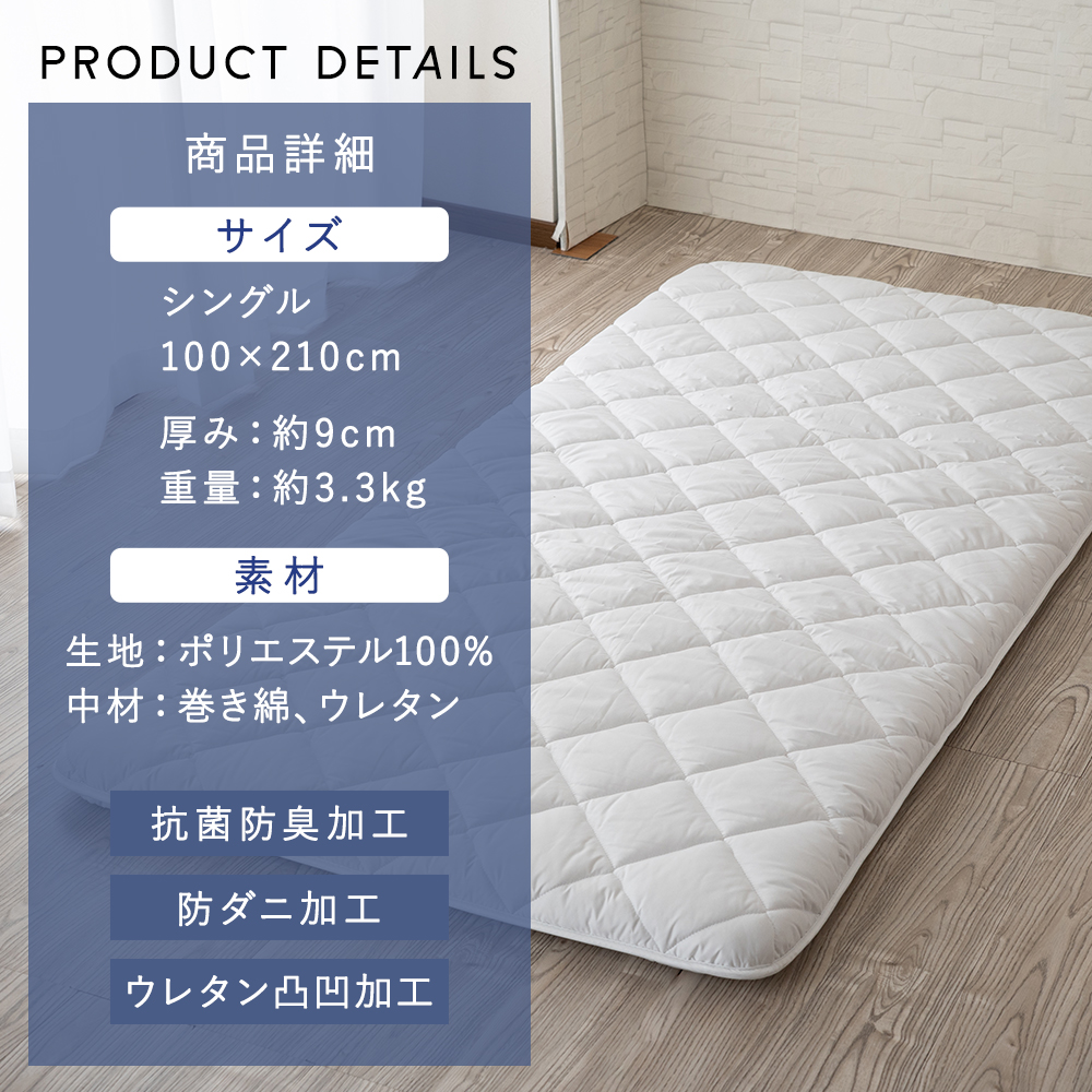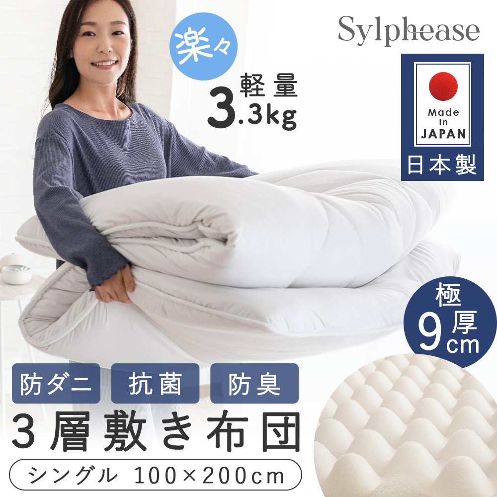 敷き布団 敷布団 日本製 極厚 国産 抗菌防臭 防ダニ シングル 厚み9cm 100×210cm ボリューム 高反発 プロファイル ウレタン へたりにくい 軽量 無地