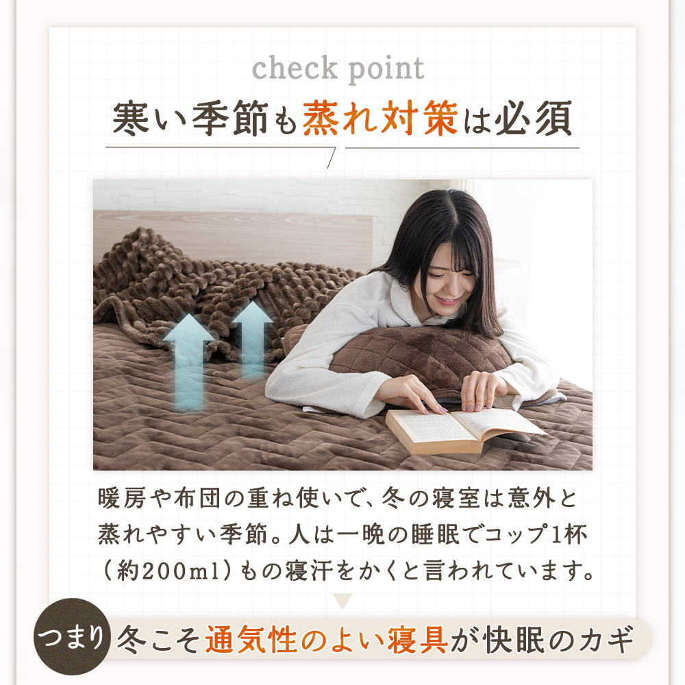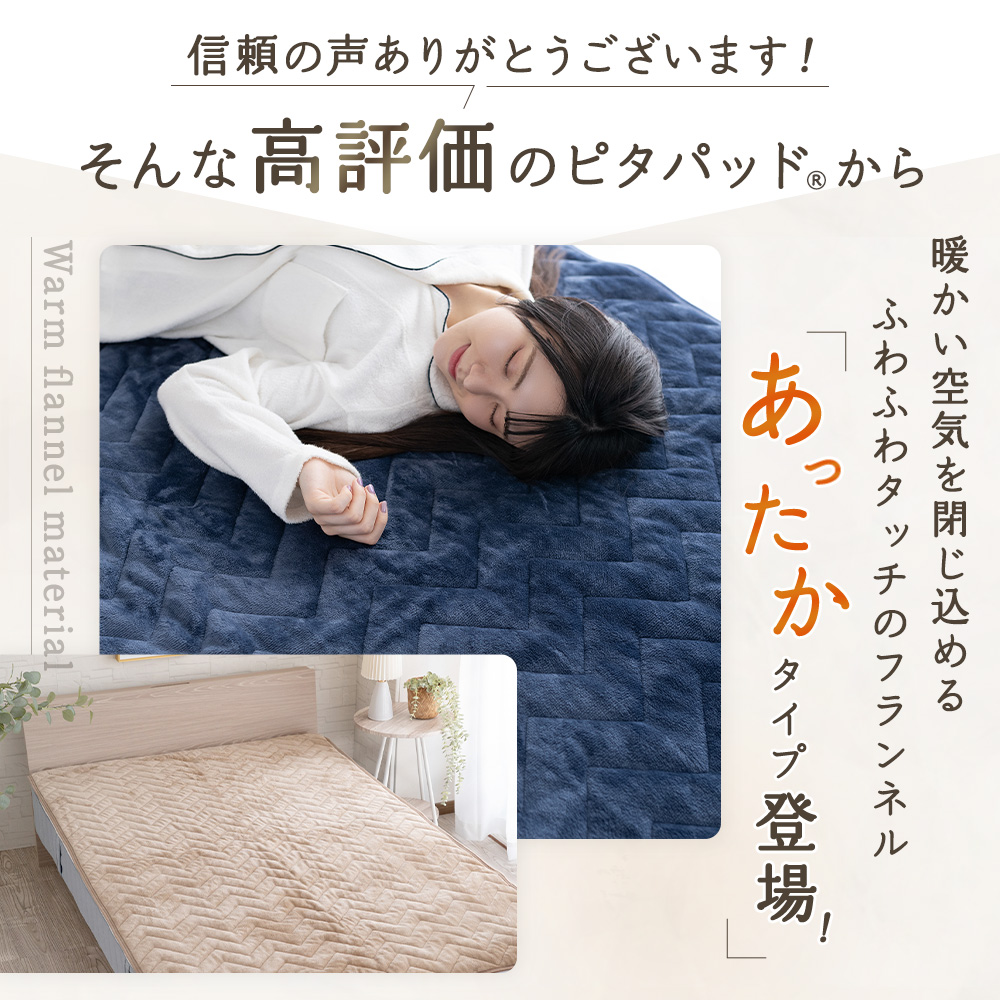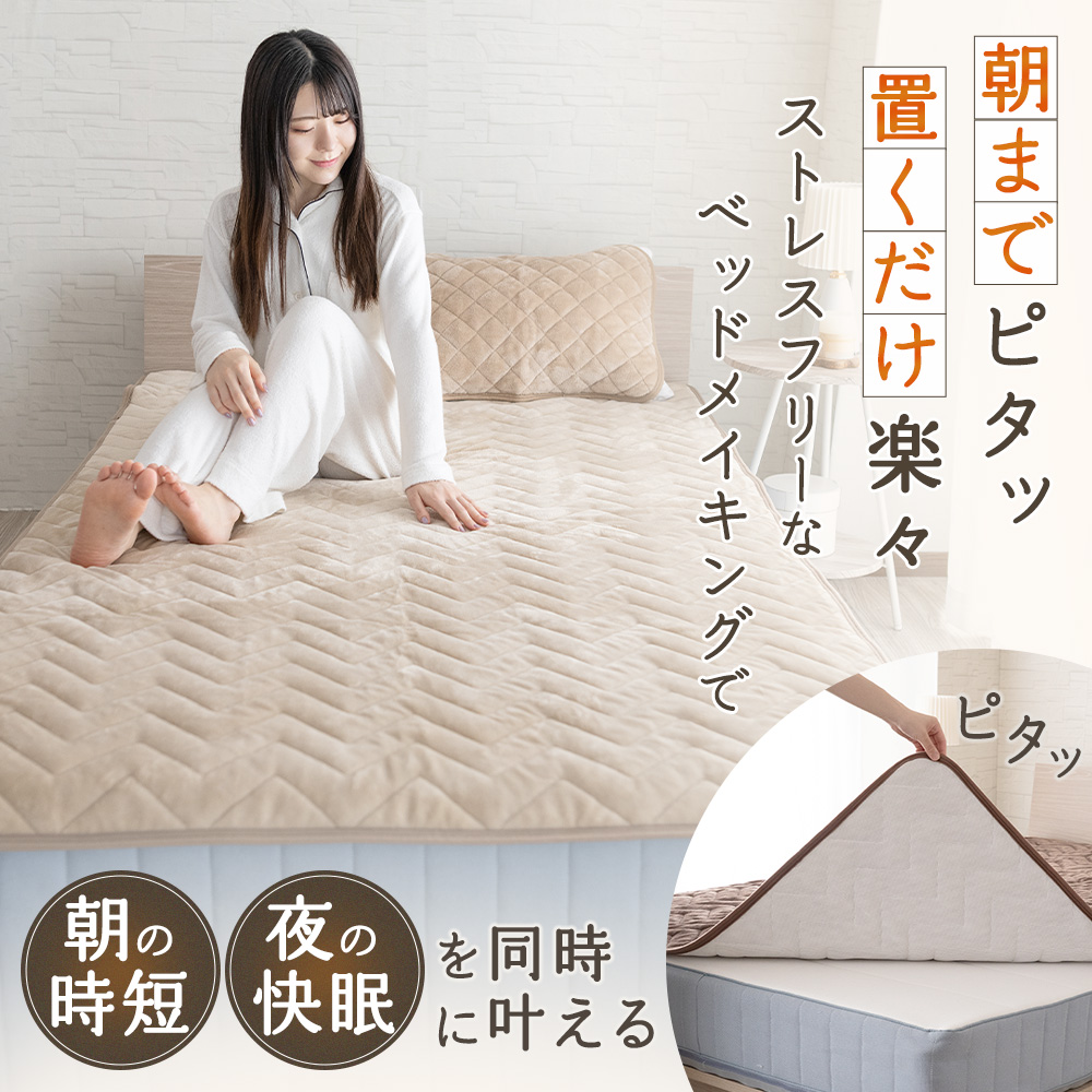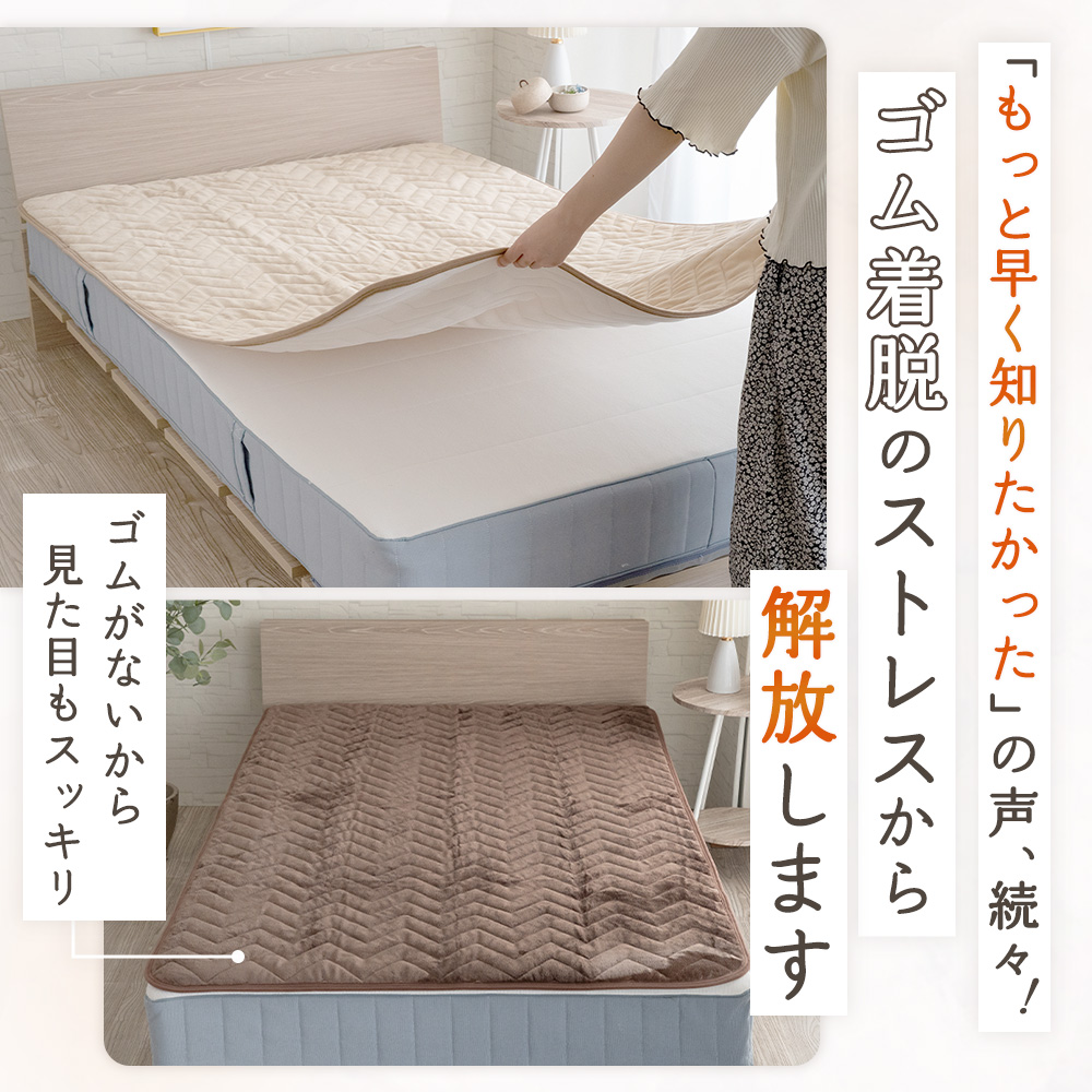 【簡単に置ける快適設計】ゴムバンドがないから、敷くだけで簡単にセットできる置くだけ敷きパッド「ピタパッド〓」。