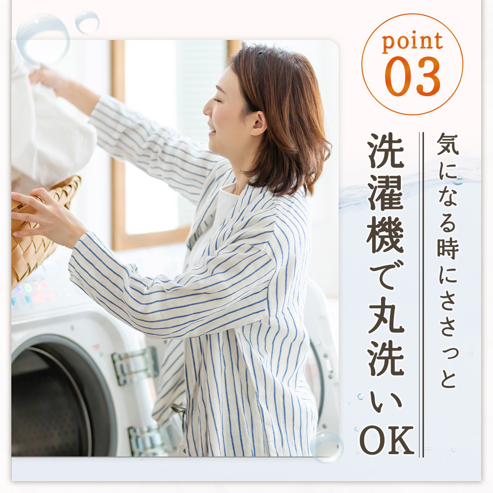 家庭用の洗濯機で丸洗いできるウォッシャブルタイプです。洗濯の際は洗濯ネットを使用し、他のものと分けて洗うことをおすすめします。漂白剤の使用やタンブラー乾燥は避けてください。