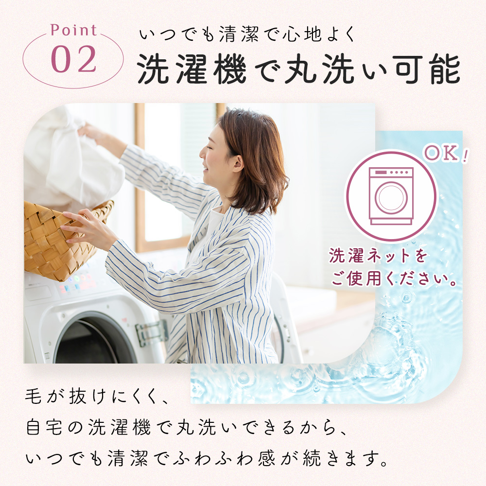 家庭用の洗濯機で丸洗いできるウォッシャブルタイプで、いつでも清潔に保てます。洗濯の際は洗濯ネットを使用し、他のものと分けて洗うことをおすすめします。漂白剤の使用やタンブラー乾燥は避けてください。
