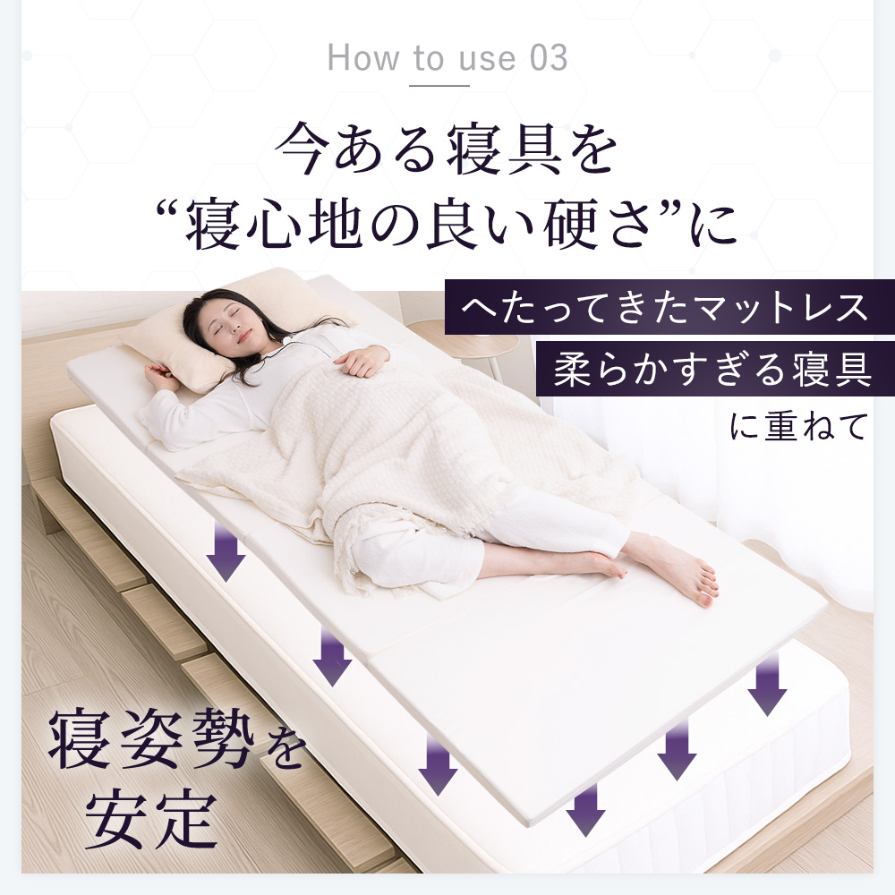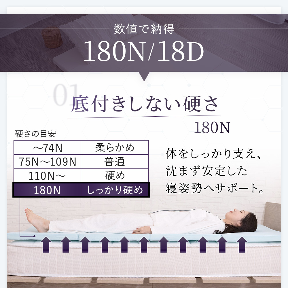 硬めの寝心地は体圧分散にも優れ、沈み込みすぎる感覚が苦手な方にも使いやすい仕様。