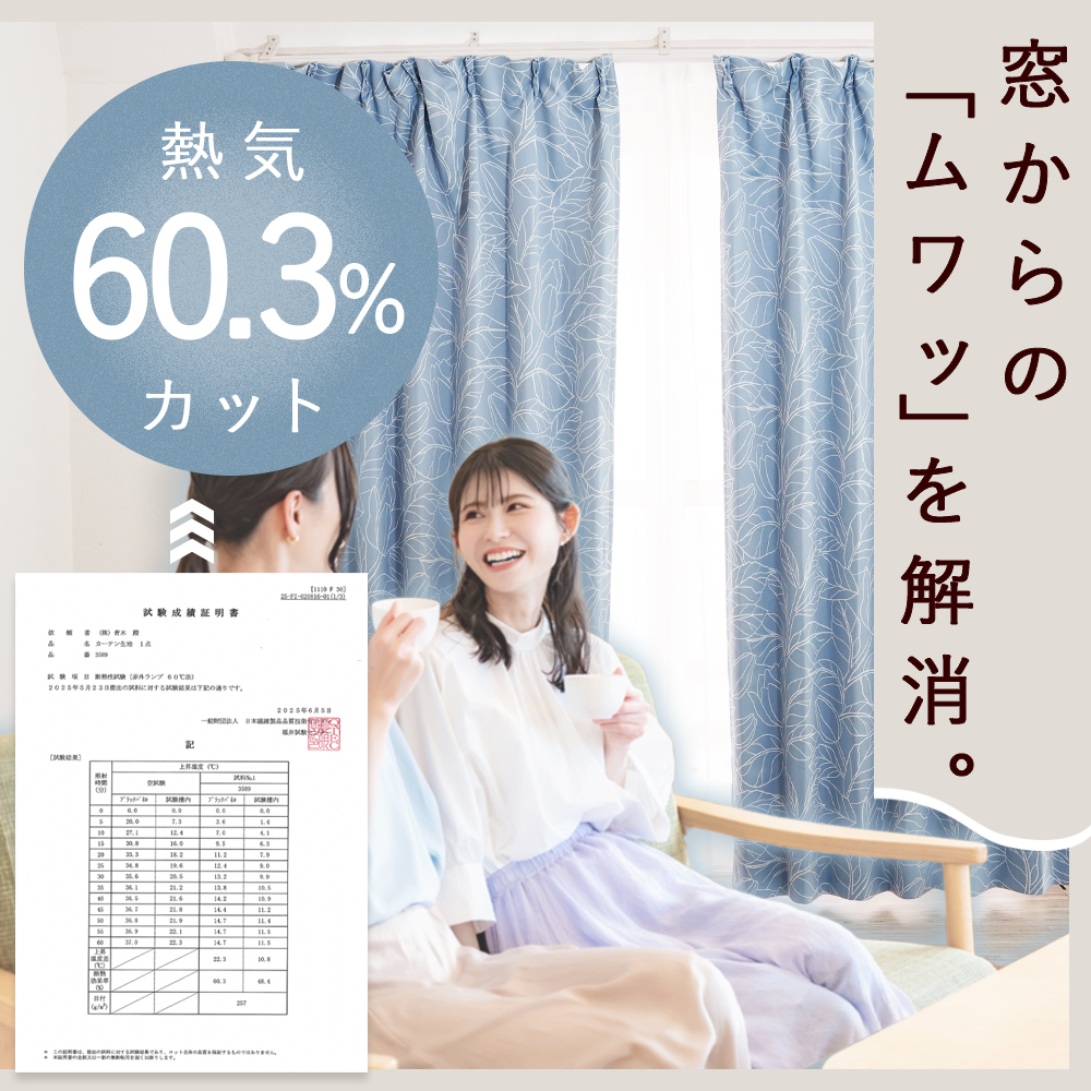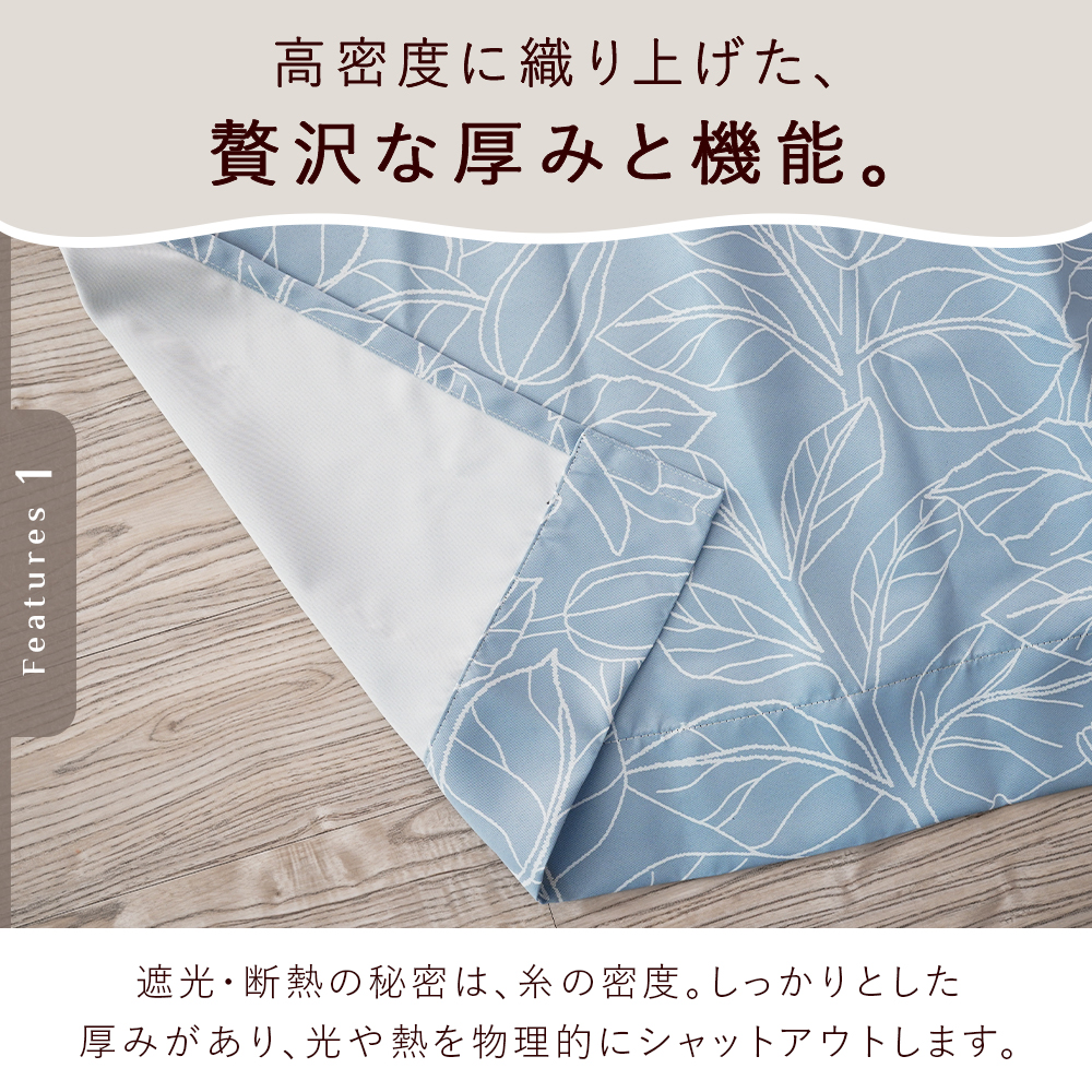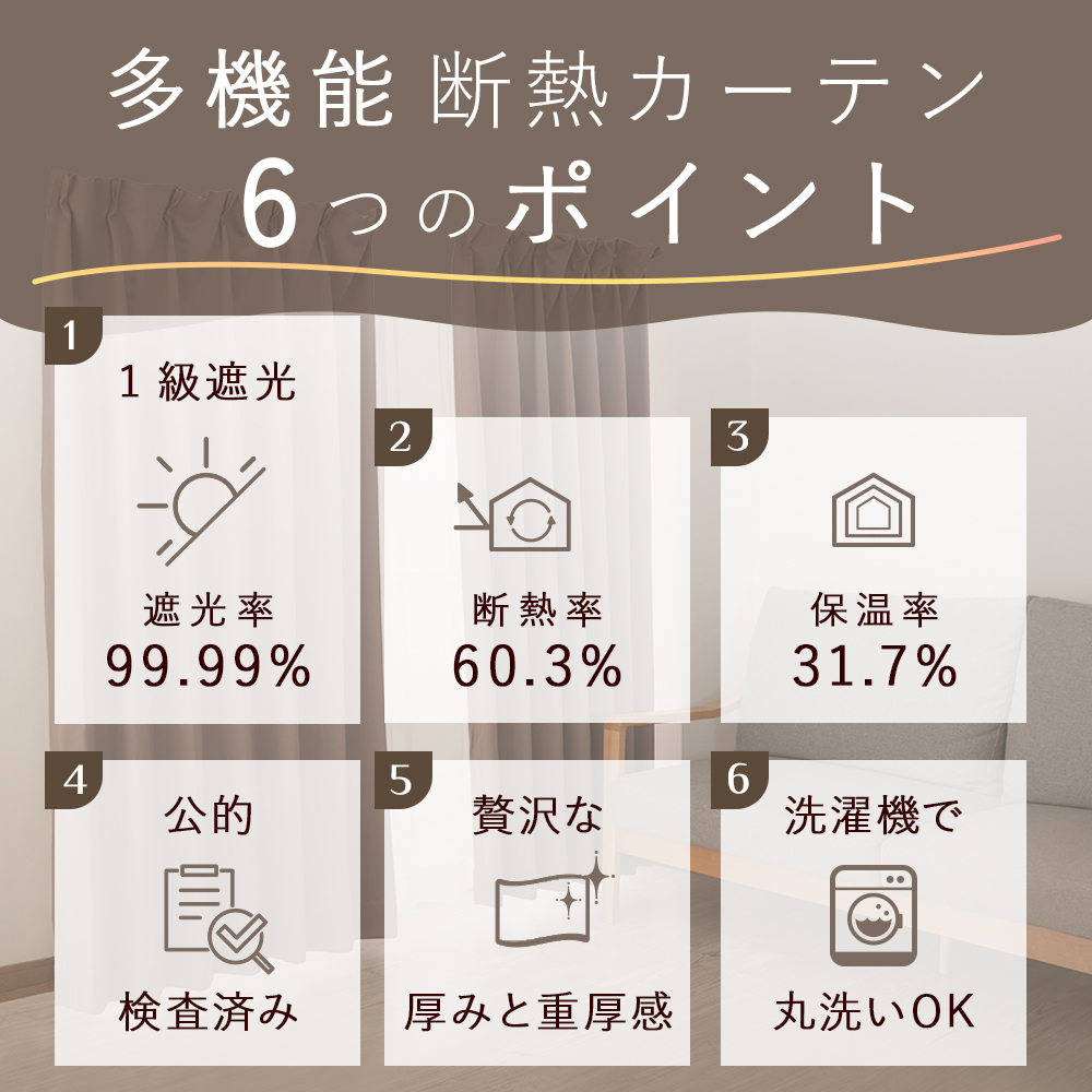 機能:1級遮光(遮光率99.99%)、断熱率60.3%、保温率31.7%、ウォッシャブル