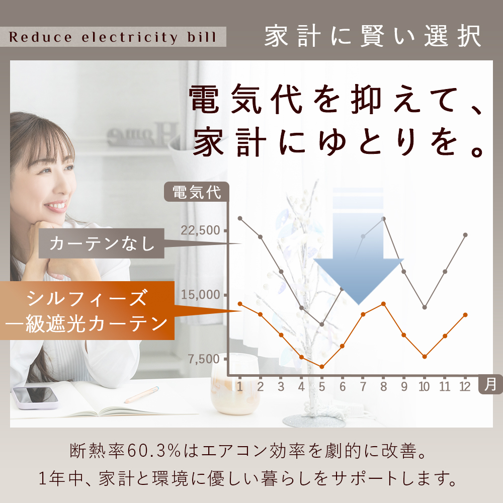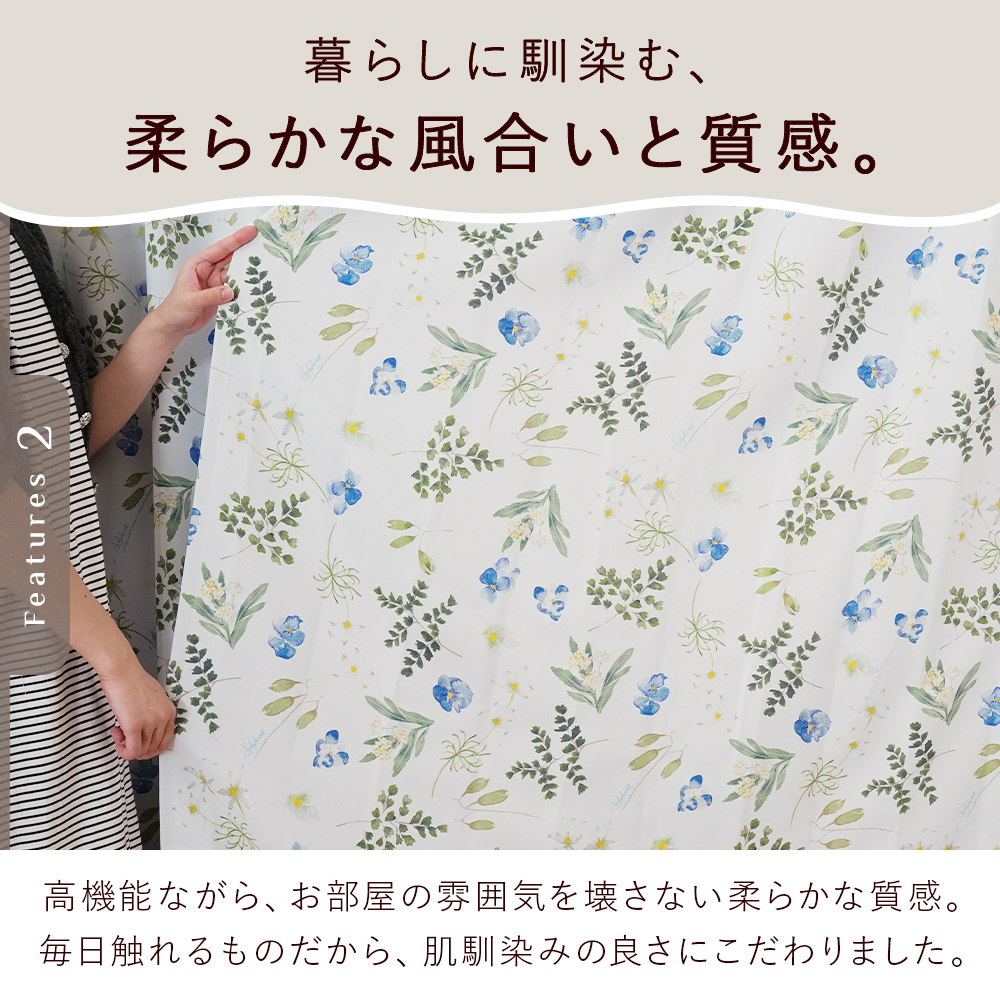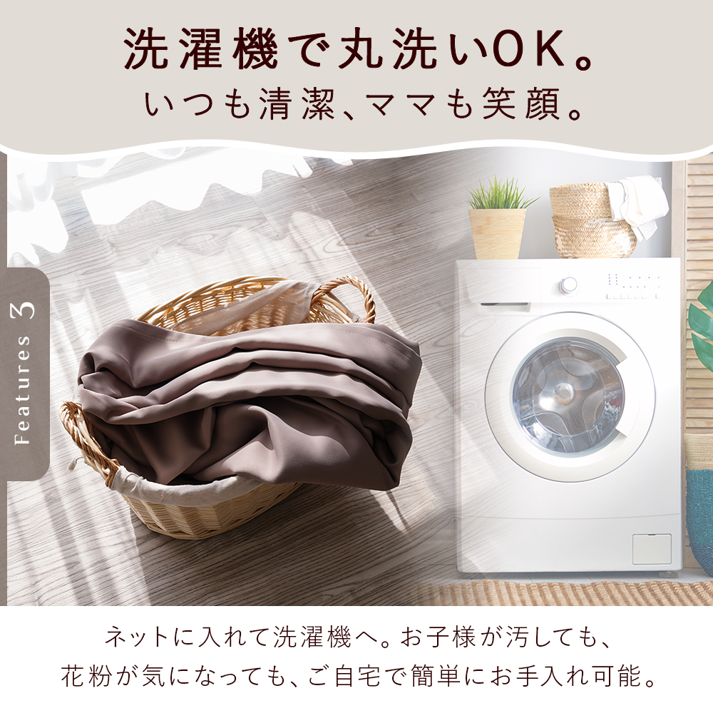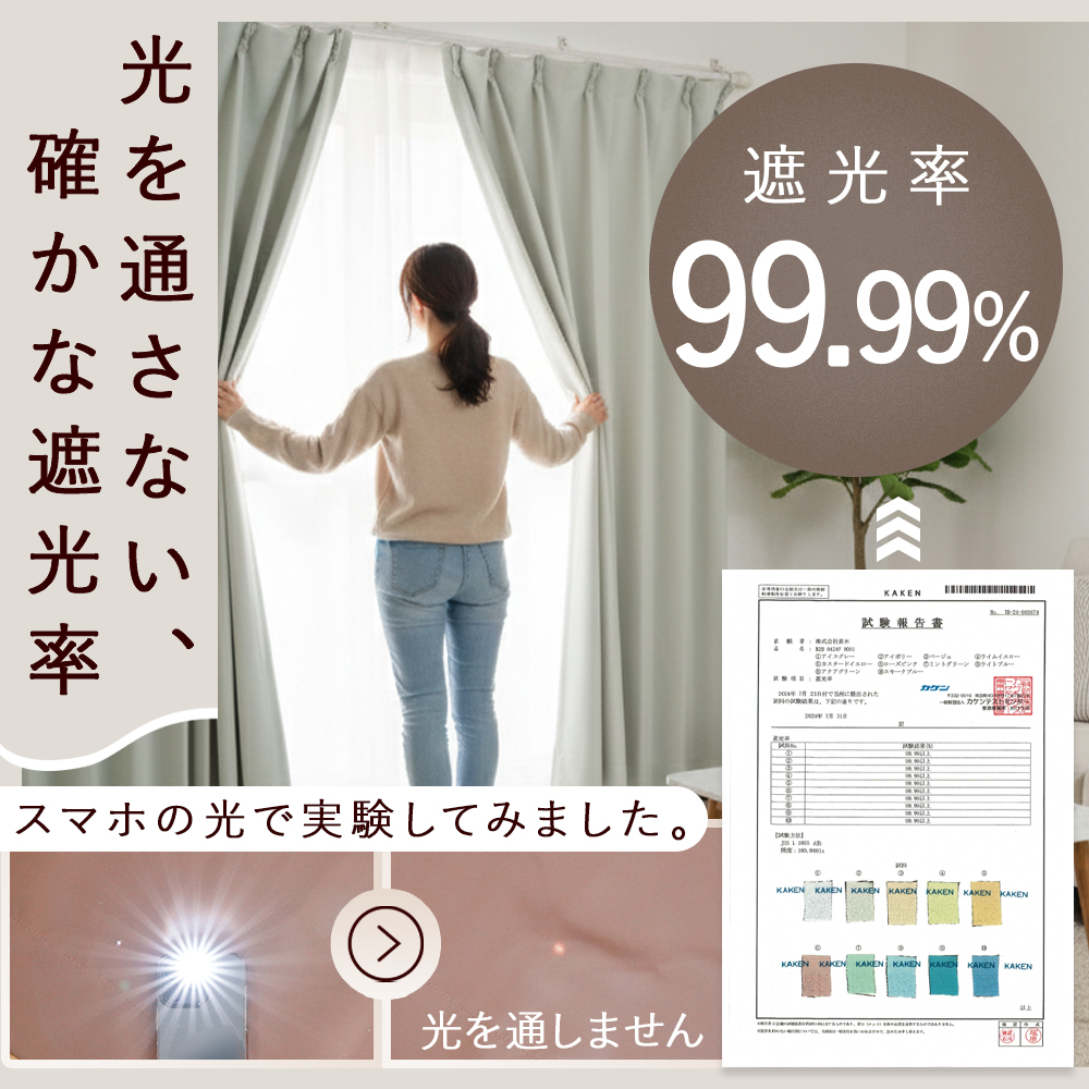 機能:1級遮光(遮光率99.99%)、断熱率60.3%、保温率31.7%、ウォッシャブル