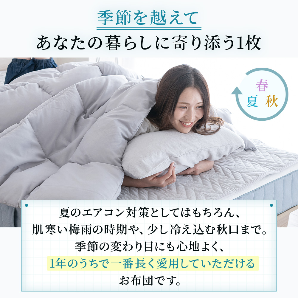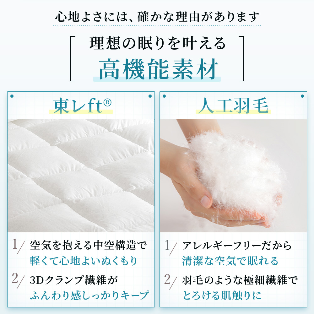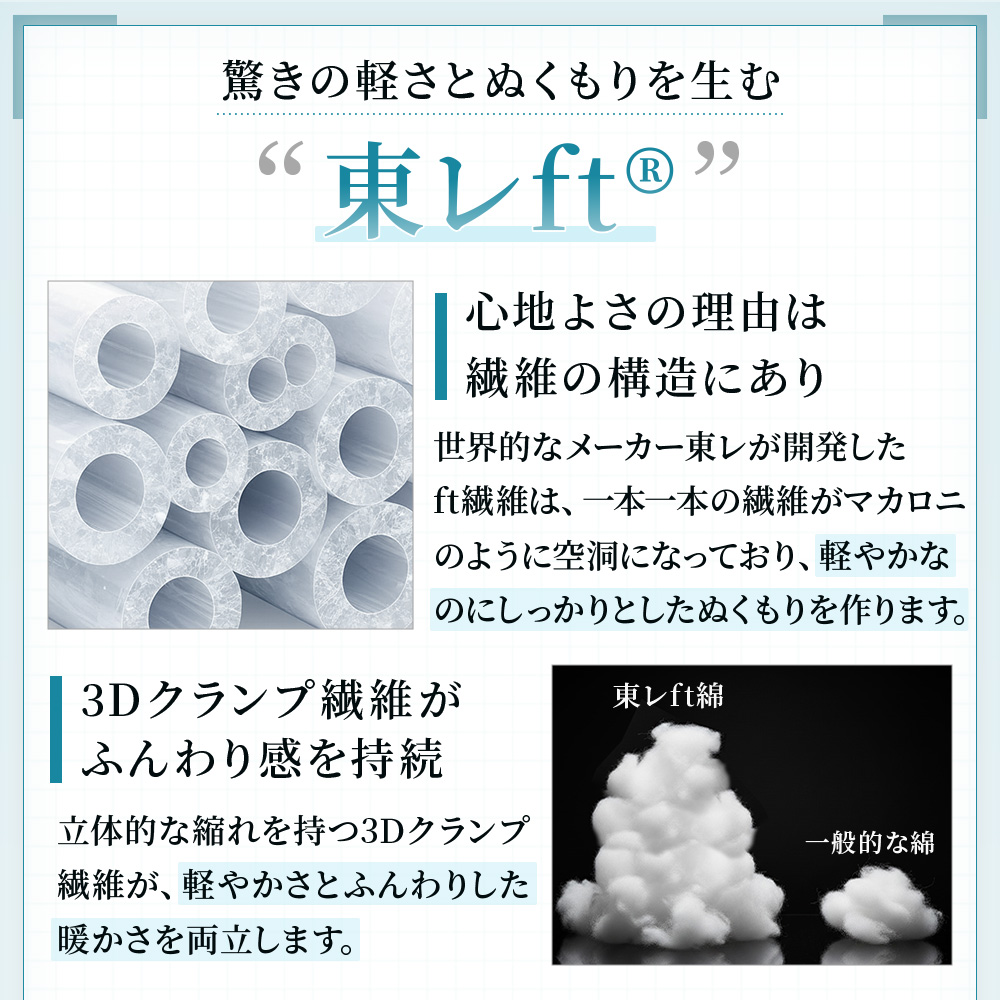 ・東レft〓繊維と人工羽毛綿をブレンドし、冷房対策にも使いやすいさらっと快適な使い心地。