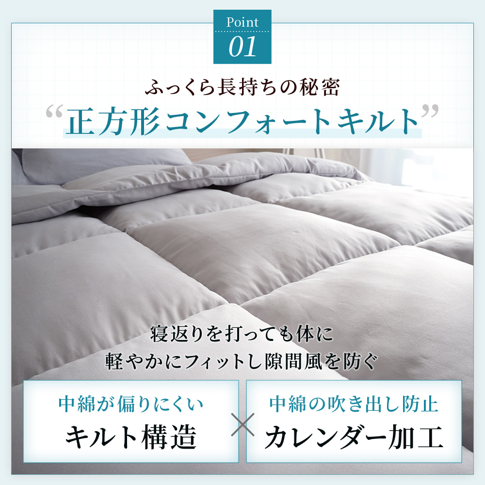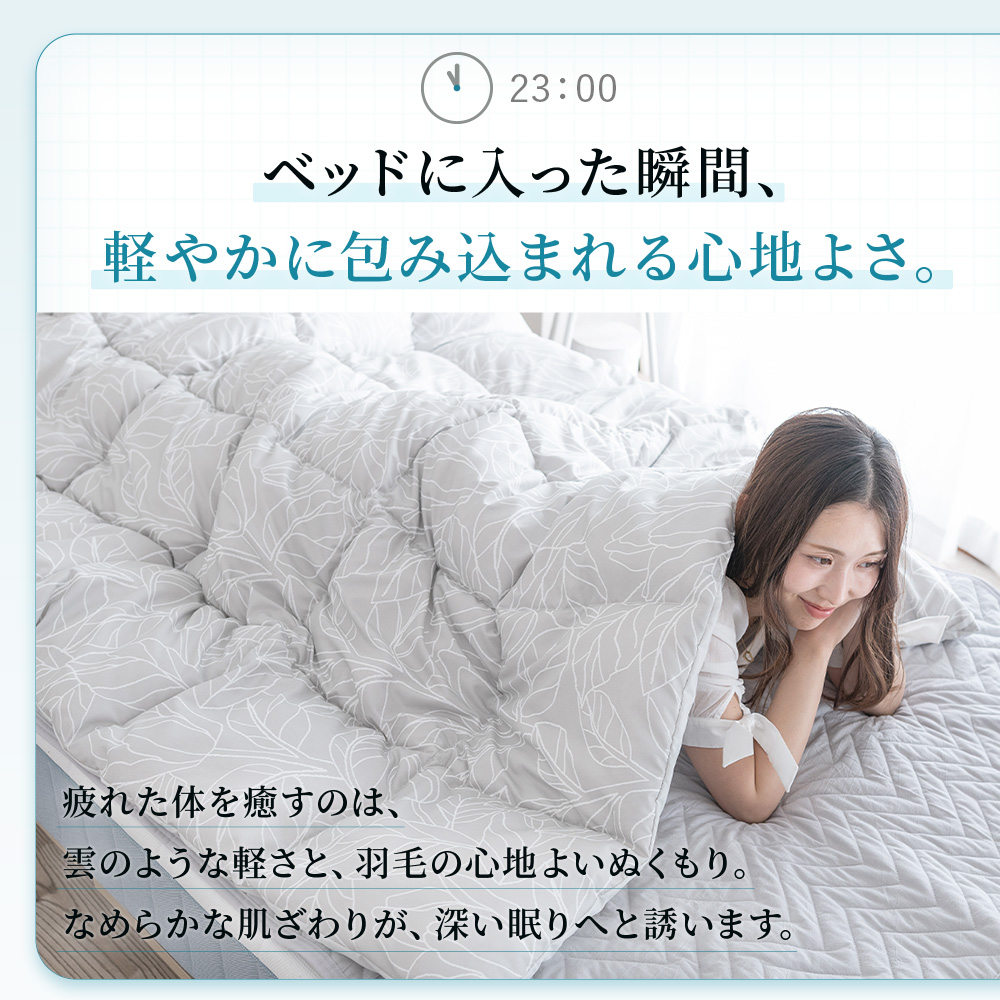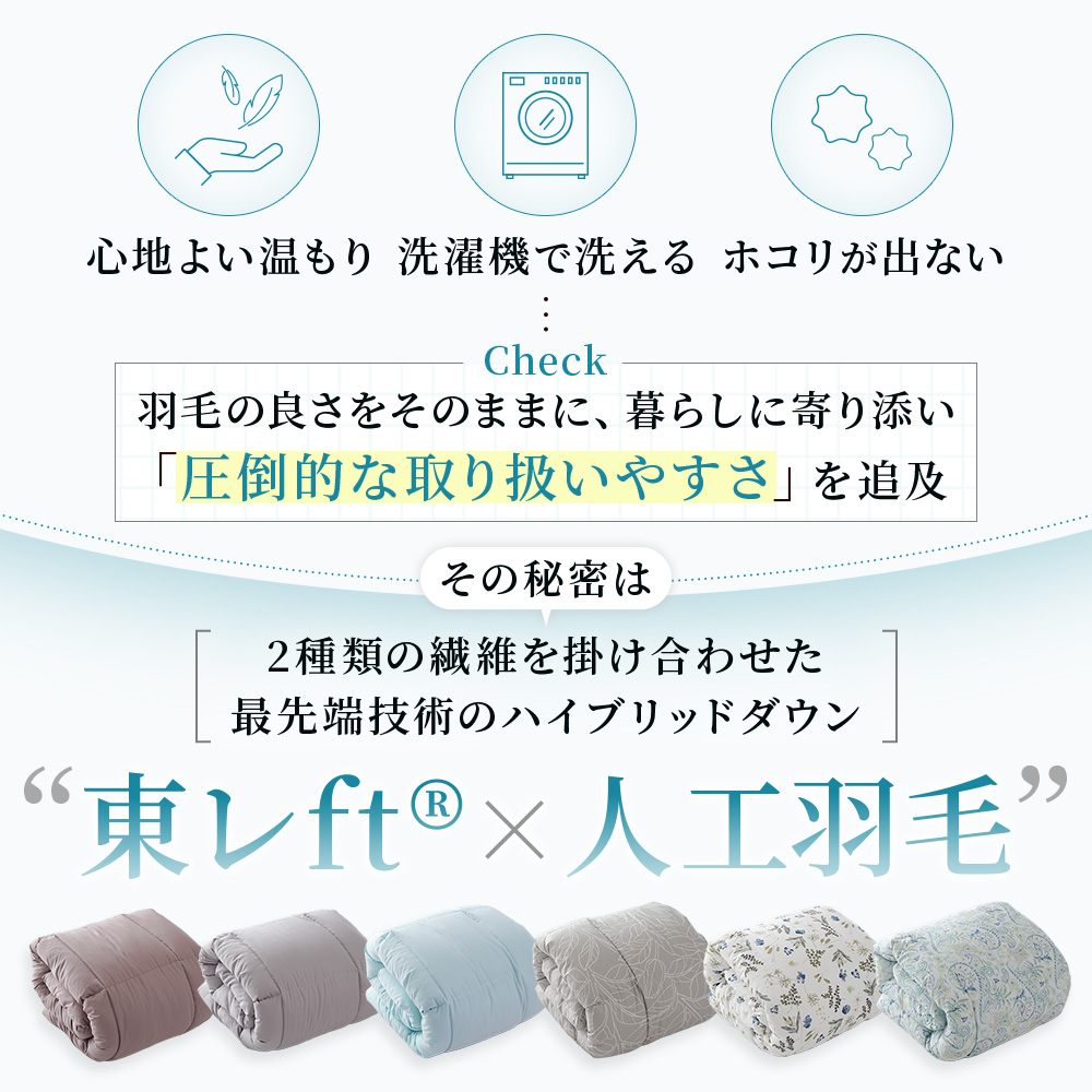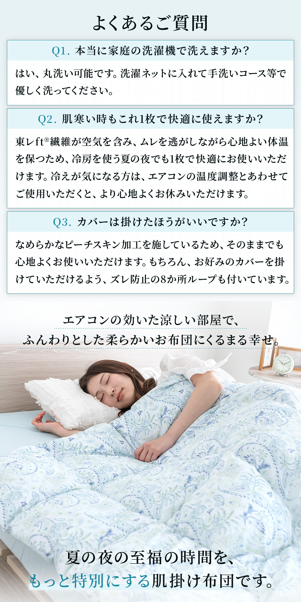 ・東レft〓繊維と人工羽毛綿をブレンドし、冷房対策にも使いやすいさらっと快適な使い心地。