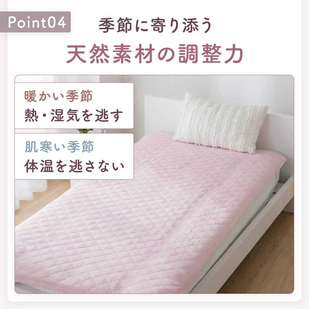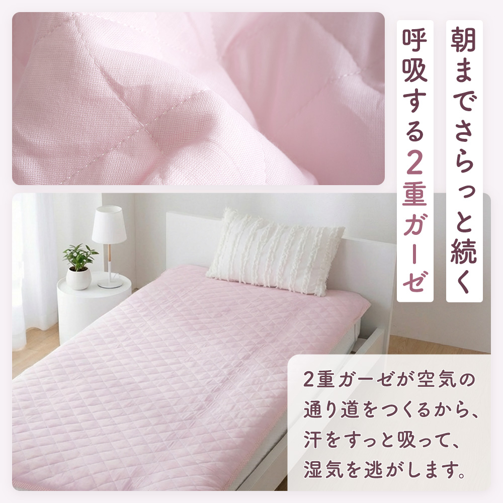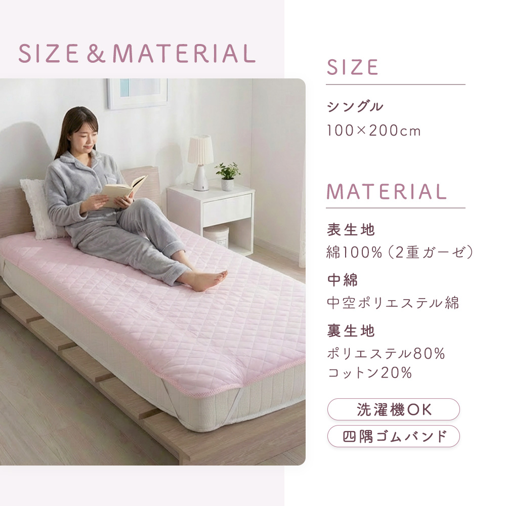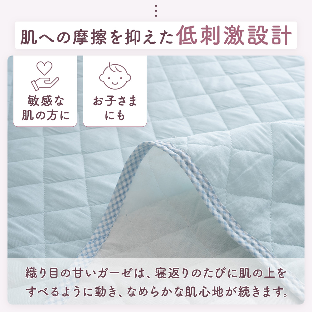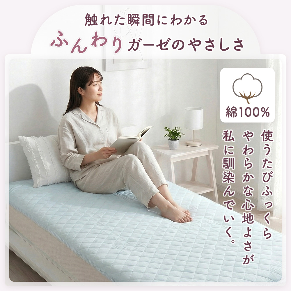 この敷きパッド シングルは、天然素材の綿100%コットンガーゼを贅沢に使い、ふんわりと空気を含む二重ガーゼが、さらさらでやさしい寝心地を叶えます。乾燥しやすい肌や、敏感に反応しやすい方にもなじみやすく、摩擦を抑えた低刺激なコットンのやさしさが、毎日の眠りを包み込みます。静電気が起きにくい綿100の敷パッドだから、ホコリを寄せにくく清潔感も長続き。
