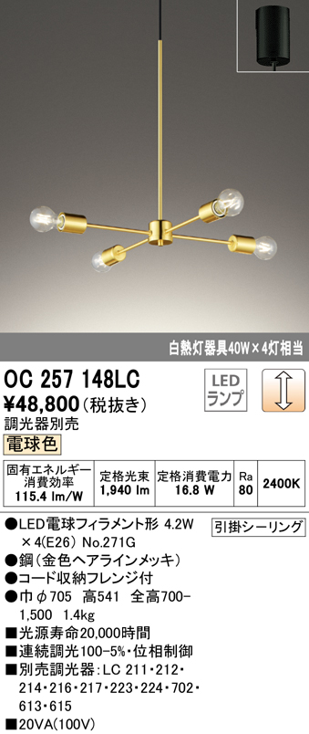 オーデリック OC257148LC シャンデリア LEDランプ 電球色 調光 ODELIC