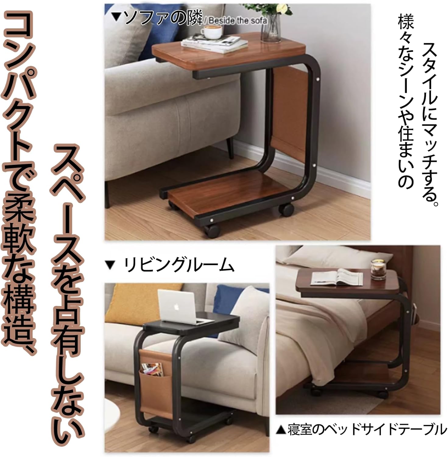 ●【コ字型テーブル】サイドテーブル キャスター付きはコ字型、ソファやベッドの下のスペースに入れ、隙間に差し込んでも使えます。場所を取らず、最大限に収納できるので、ソファのサイドテーブルやリビングのサイドテーブルとしてお使いいただけます。