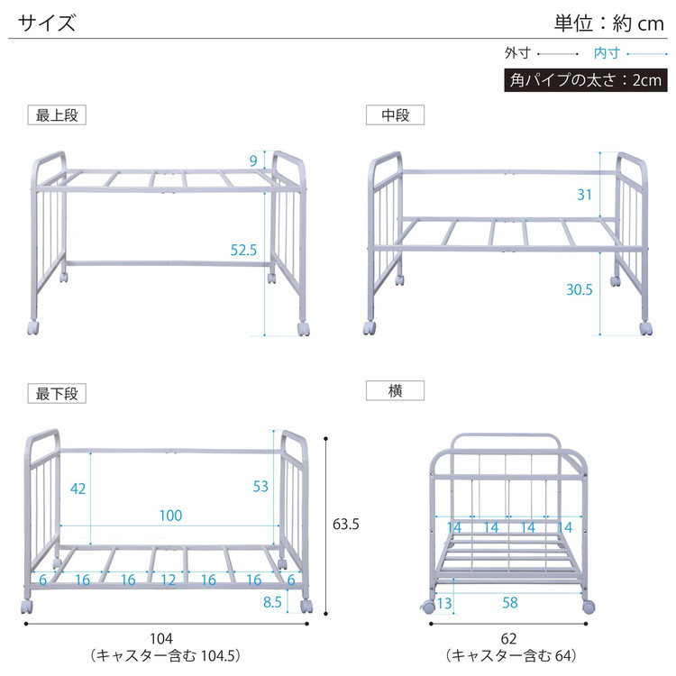 | ■サイズ/重量 | 幅104.5x奥行62x高さ63.5cm(キャスター含む奥行約64cm) |