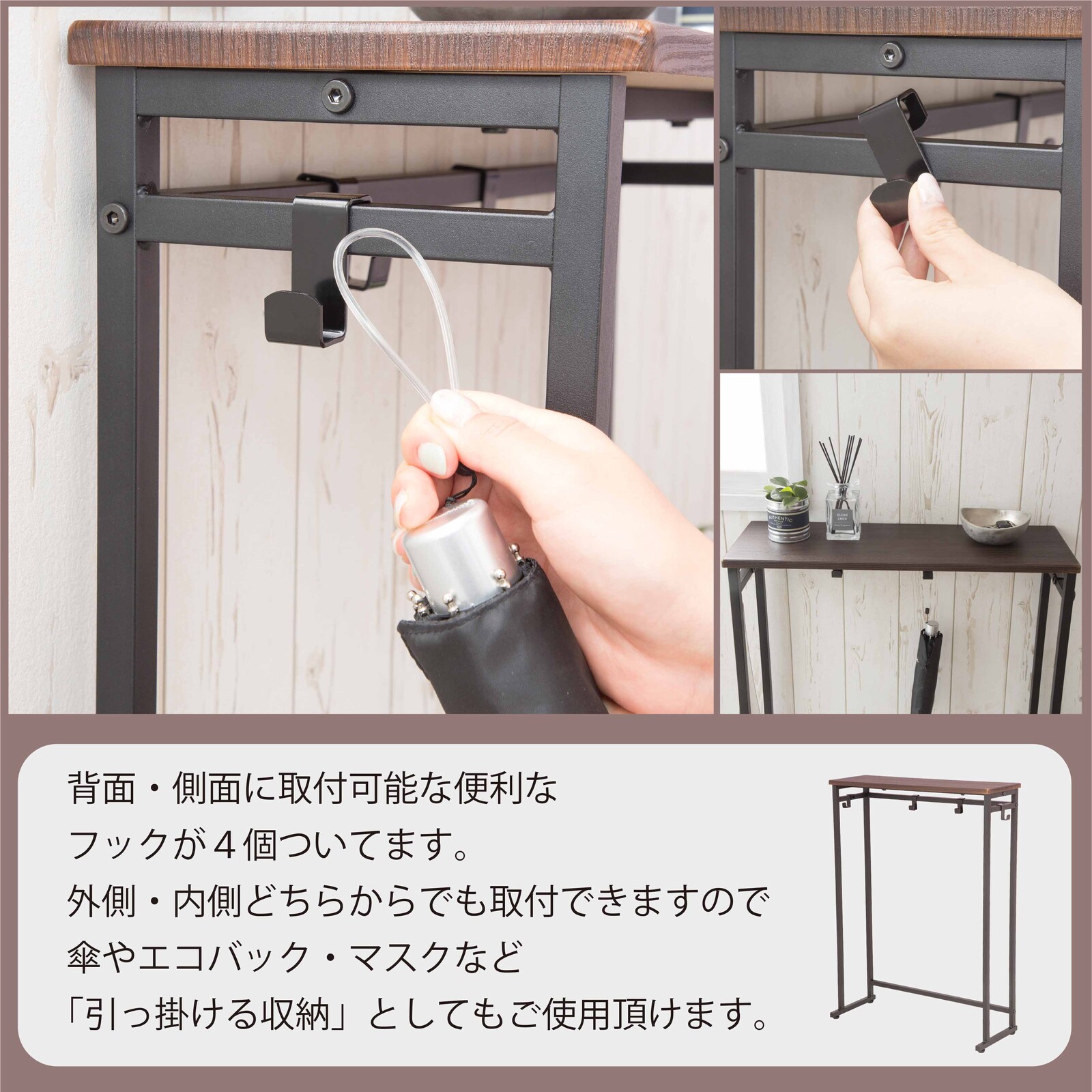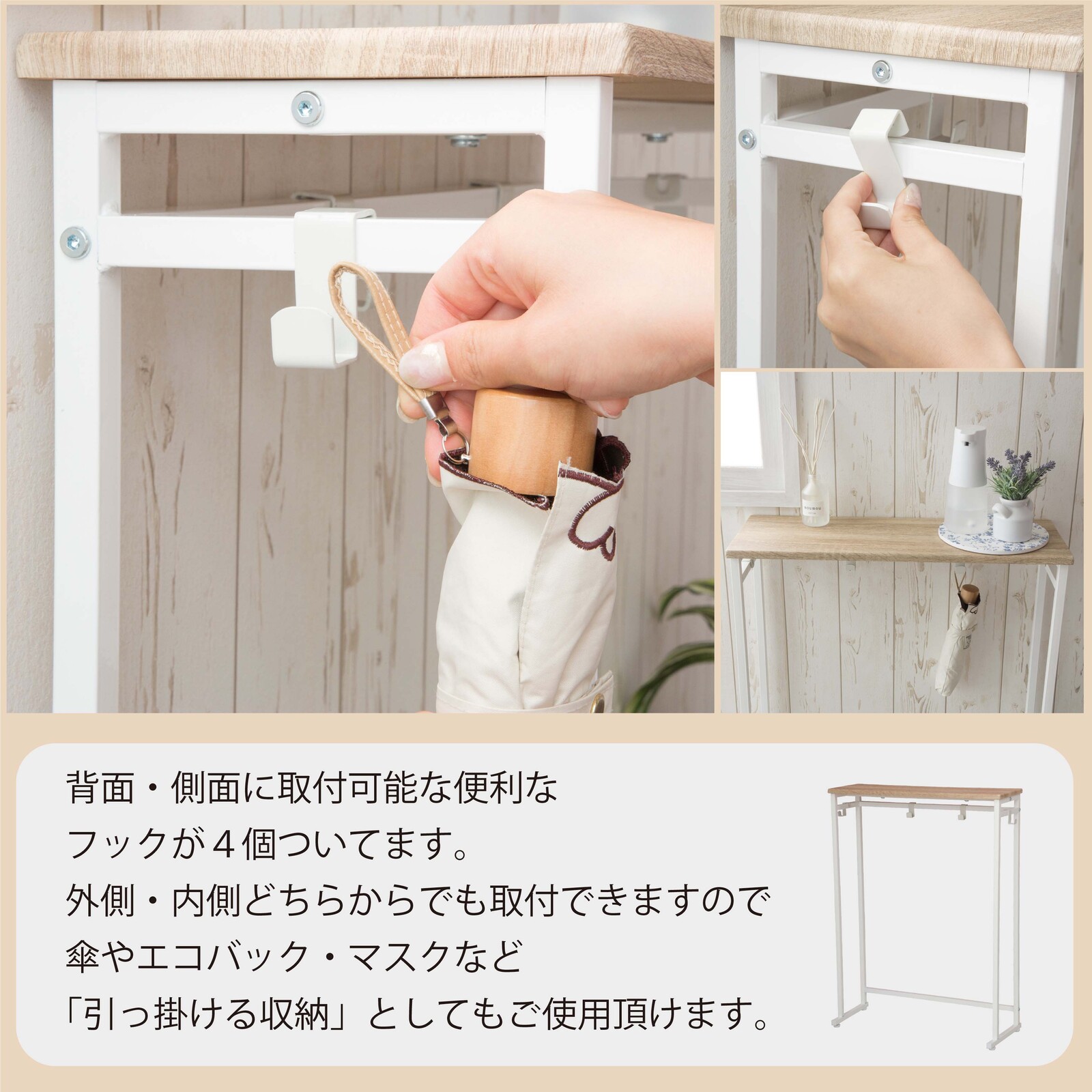 ・背面、側面に取り付け可能な便利なフックが4個ついています。傘やエコバック、マスクなど引っ掛ける収納としてご使用頂けます。