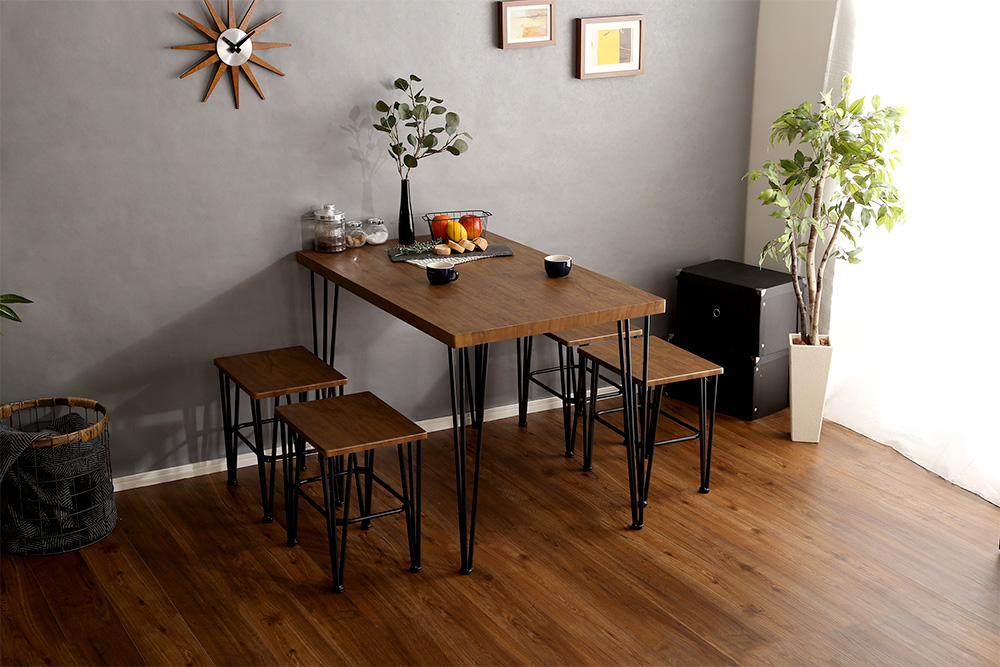 ヴィンテージダイニング5点セットスタイリッシュな鉄脚のダイニングセットが、お部屋をヴィンテージスタイルに演出します。 どんなお部屋にも合わせやすい、落ち着いたシャビーオーク、ウォールナットの2色を採用。 コンパクトサイズなので、ご家族だけでなくカップルの方にもお使いいただけます。