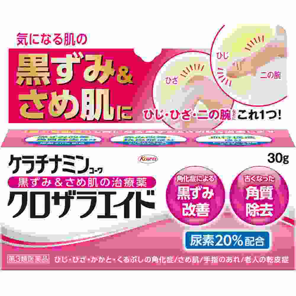 ケラチナミンコーワクロザラエイドは、黒ずみ(※角化症による)・さめ肌の治療薬です。黒ずみ(※角化症による)とは、角質層が厚くなることで、分厚い皮膚が黒っぽく見える状態のことです。さめ肌とは、ザラザラした肌の状態のことです。