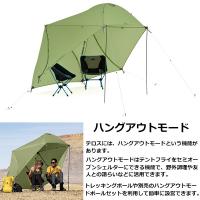 ●設 計:自立式 (3ハブ)、テンションリッジ、APEXベント、ライトバー付き、ハングアウトモード可能、ドア2、前室2