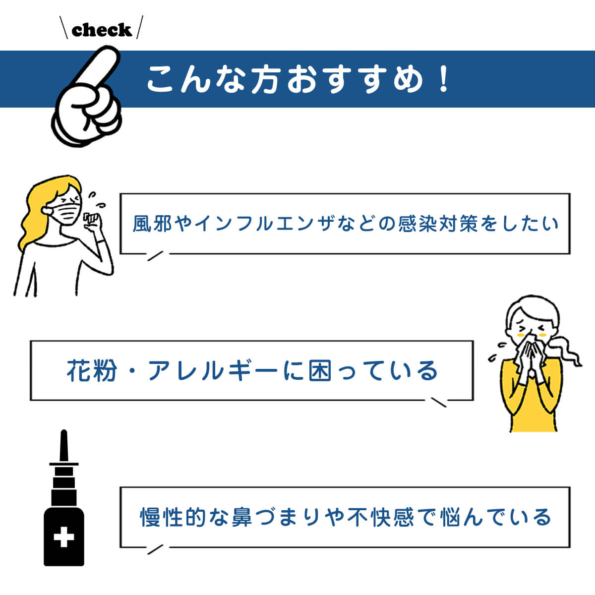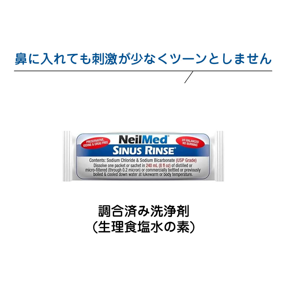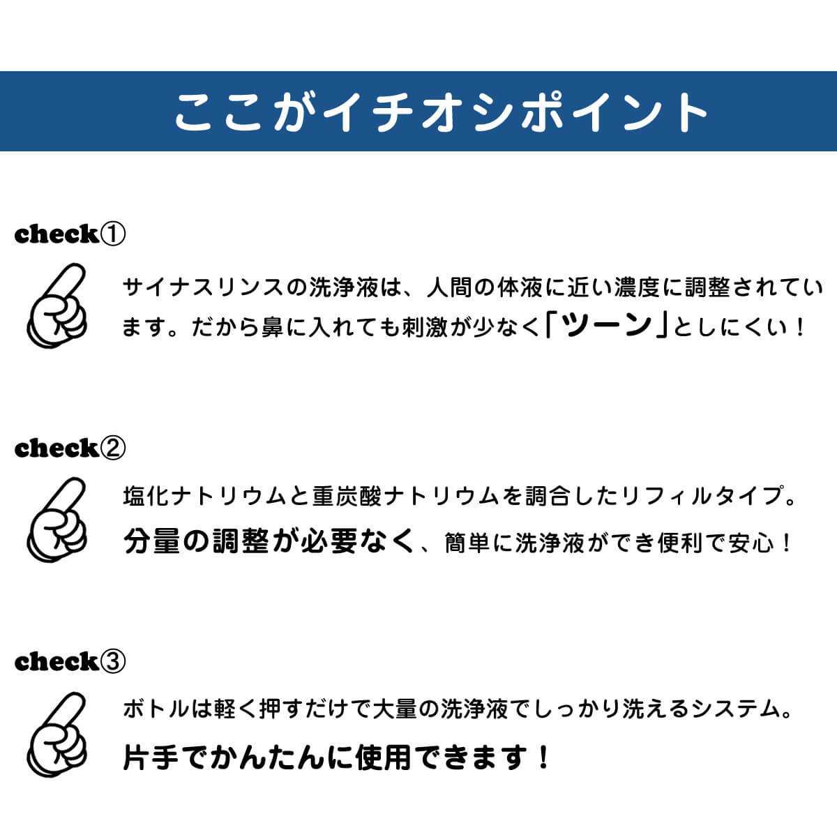 サイナスリンスの洗浄液は、人間の体液に近い濃度に調整されているので、鼻に入れても刺激が少なく「ツーン」としません。