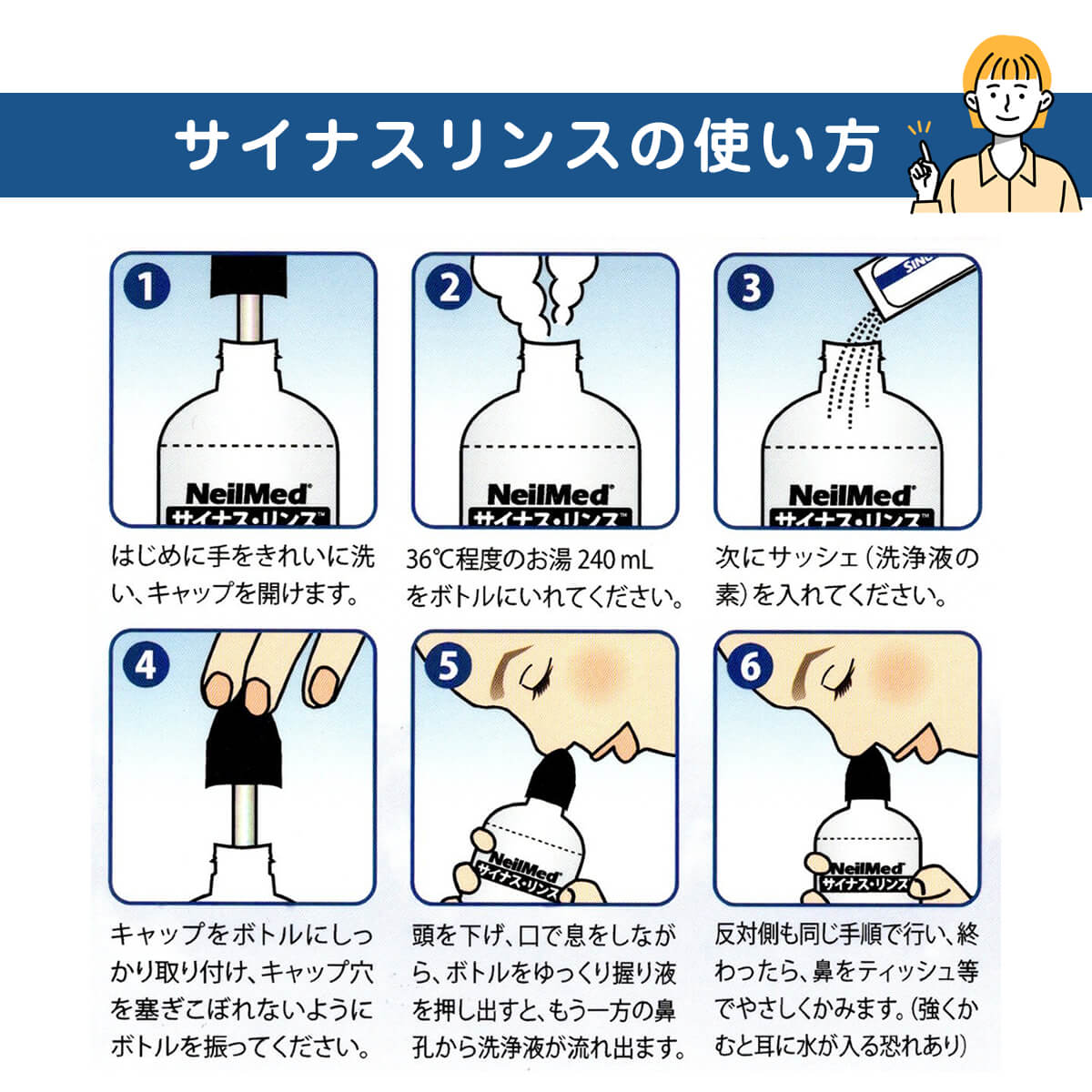 点鼻薬の使用前にサイナスリンスで鼻洗浄をすることで、点鼻薬がより有効、効率的になります。
