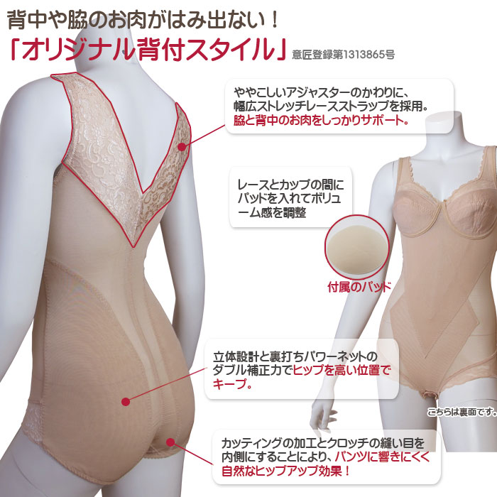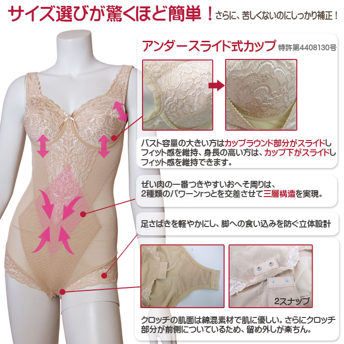 バストやからだの動きにあわせてフィットするノンワイヤーのアンダースライド式カップや、背中・脇のお肉まで すっきりと補正する背付きスタイル、パワーネットと立体設計。
