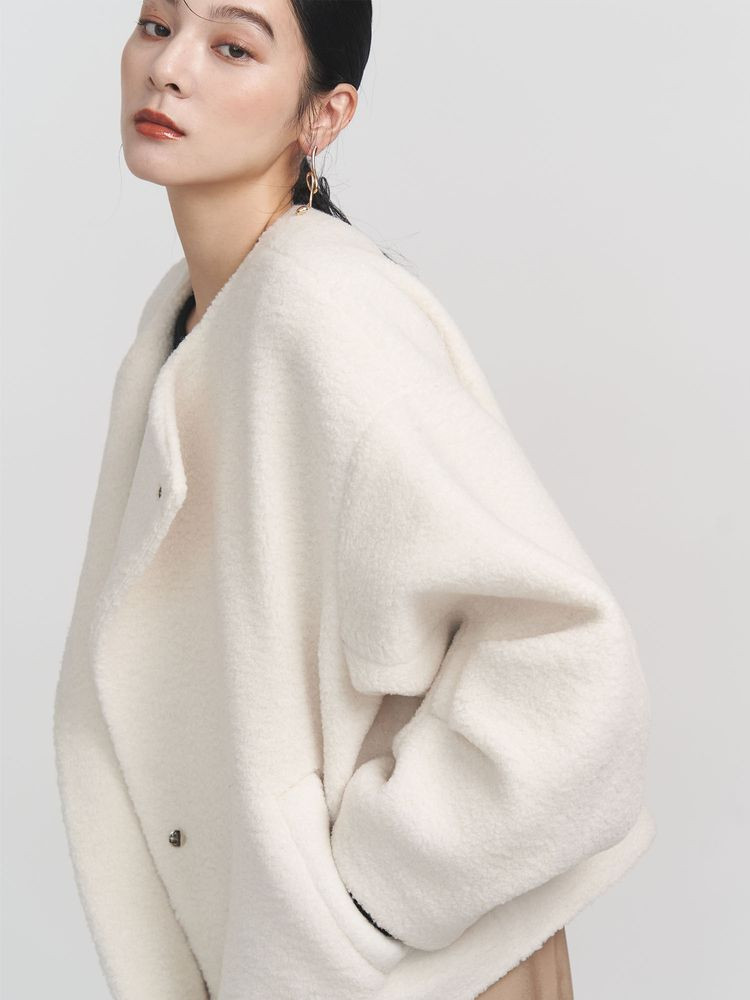 ジャージーボア素材を使用したノーカラーブルゾン。
