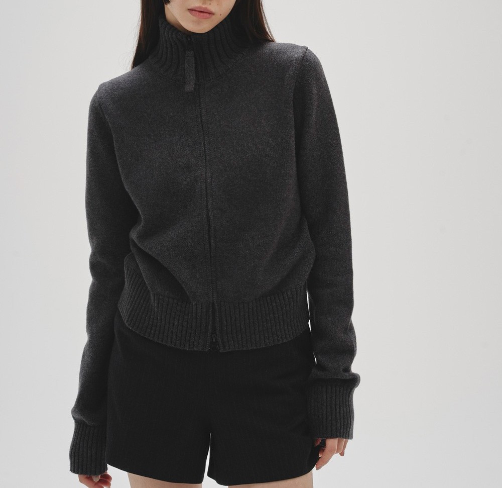 コットンカシミアの糸を使用したジップニット。コットンの柔らかさとカシミアの贅沢な肌触りが絶妙に融合し、着心地のよさを実現。身頃と同じ糸で編み上げたファスナー引き手や、太めのリブのハイネックデザインが目をひく一枚。フロントには逆開ファスナーを使用しているので、下側を少し開けた肌見せスタイルもおすすめです。