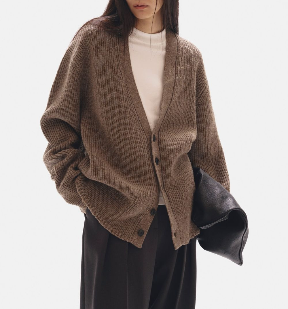 ラムウール混の糸で編み上げたリブニットカーディガン。程良く厚みのある編地が立体的なシルエットを生み、身体を包み込むような柔らかさも魅力。袖口と裾にあしらった繊細なハンドステッチが、控えめながらも印象的なアクセントに。肩のラインが落ちたゆるっとしたサイズは程良く力の抜けた印象で、パンツと合わせたマニッシュな着こなしはもちろん、インナーにビスチェを合わせて肌見せで抜け感をプラスするスタイリングもおすすめです。