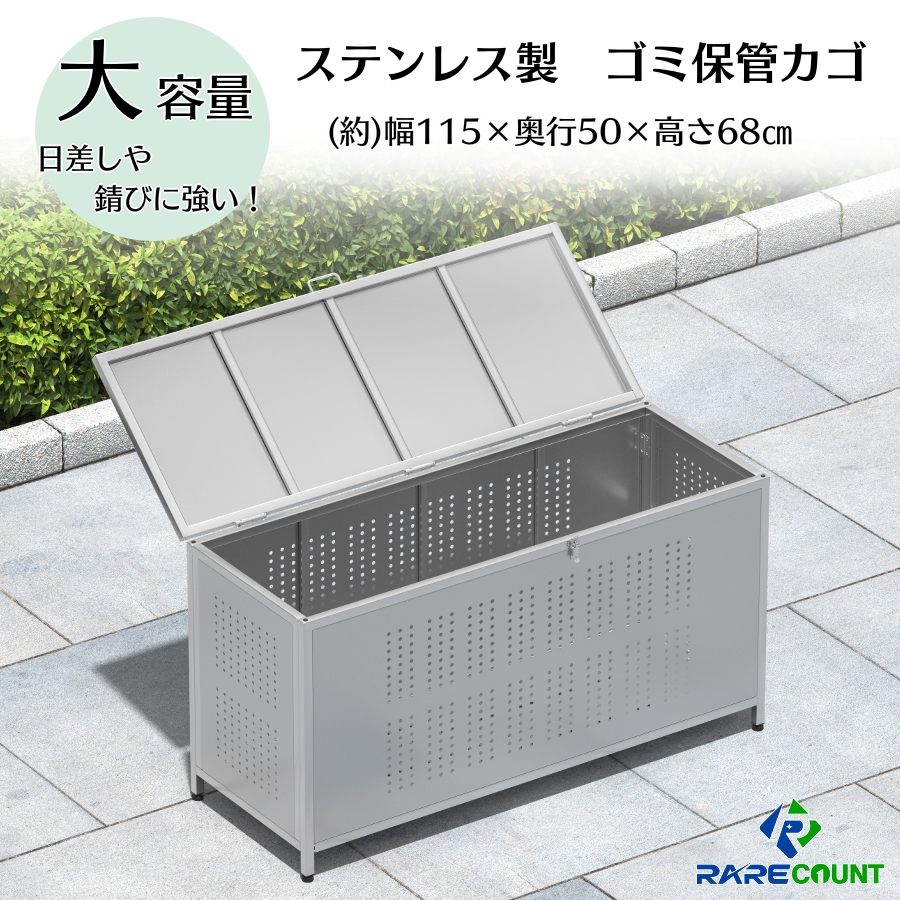 シンプルな外観で周りの景観を損ないゴミステーション! 屋外設置に最適なステンレス製でできているため雨風や日差しに強くて丈夫! 《ゴミをたっぷり保管できる》 350Lで45Lのゴミ袋が約4〜6個入るたっぷり収納! 自宅の玄関、軒下、ベランダ、バルコニー、業務用、自治体などにあると一時的にゴミを保管できて便利です。 《動物から荒らされる心配なし》 丈夫で穴が小さいため、カラス、野良猫、イタチなどの動物からゴミを荒らされるのを防いでくれます。 《簡単組み立て》 ピンを差し込むだけの簡単設計にしているため、1人で組み立て可能! すべての付属品が揃っているため、商品到着後にすぐに組み立ててその場で使用することができます。 《幅広い使用方法》 ゴミを保管する以外にも、農作物などの乾燥と保管、園芸用品や工具の屋外収納庫としてなど幅広い使用方法があります。 板状の蓋があるため、雨の侵入を防ぐことができます。また、脚は地面から離れているため水たまりなどの影響も受けません。 蓋には取っ手がついているため使い勝手が良く、誰でも開閉しやすいです。また、蓋は平らであるため上に一時的に物を置いたり、作業台としても使用できます。 《高さ調節可能なアジャスター付き》 多少平らでない場所でも、付属のアジャスターで高さを調節することができて便利です。 【商品仕様】 サイズ(約):横幅115×奥行50×高さ68cm 容量(約):350L 重量(約):14.5kg 材質:ステンレス ※1つずつ製造しているためサイズや重量は多少の誤差があります。 ※連結ピンが入りにくい場合は、底板を置かずにカゴ本体を少し広げてひし形にし、穴が合うように角度調整すると連結ピンが入りやすくなります。または、ペンチでずれている場所を挟み、軸管を上下とも真っすぐに合わせてください。 ※商品に不具合や不明な点があれば気軽に連絡してください。※製造過程による避けられないキズ、スレが多少あります。