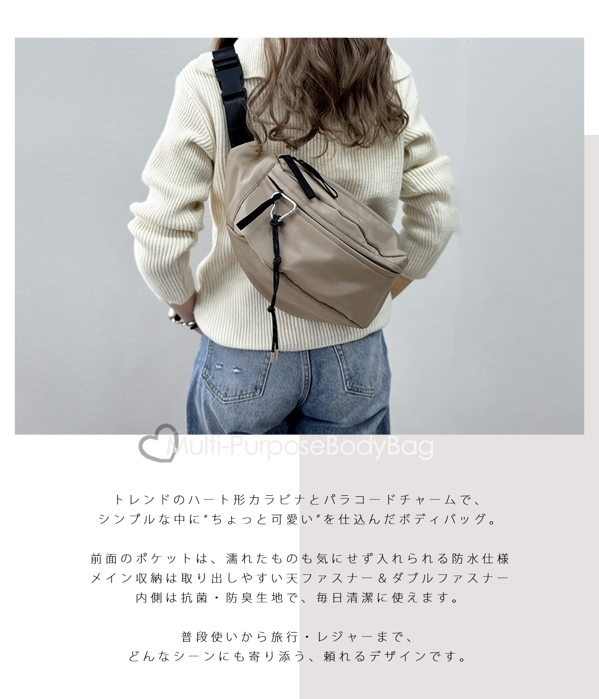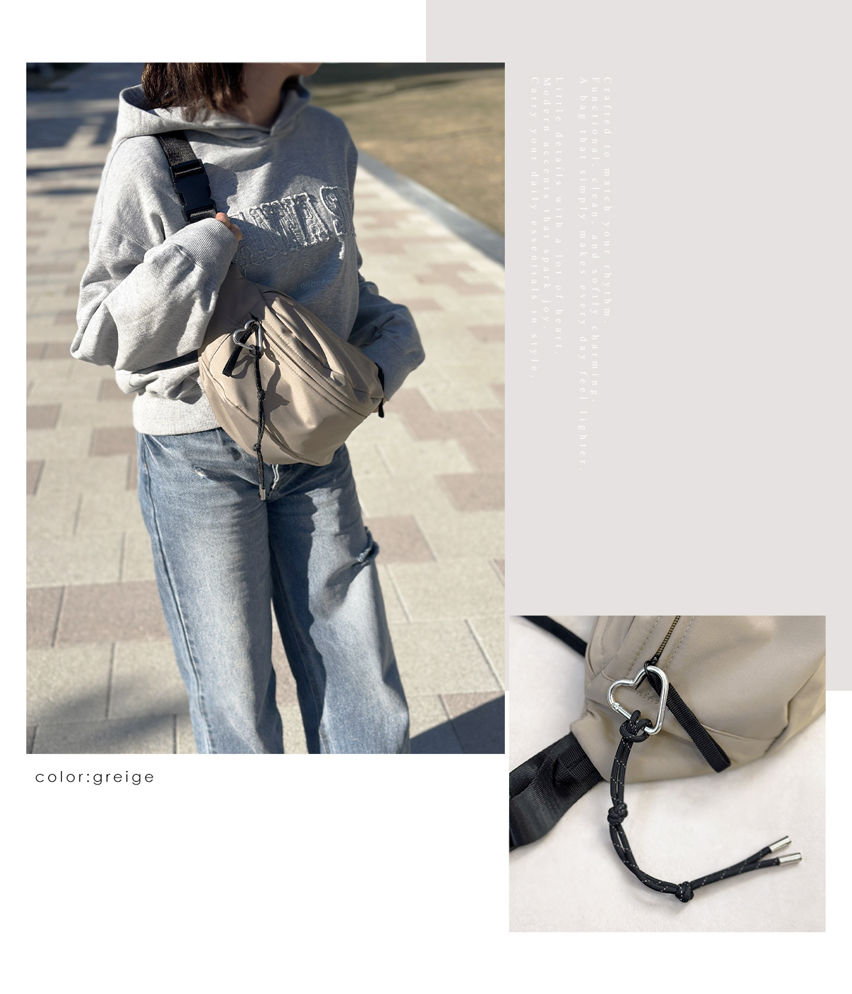 ハート型カラビナ×パラコードチャームがトレンドライクな防水ポケット付きボディバッグ。