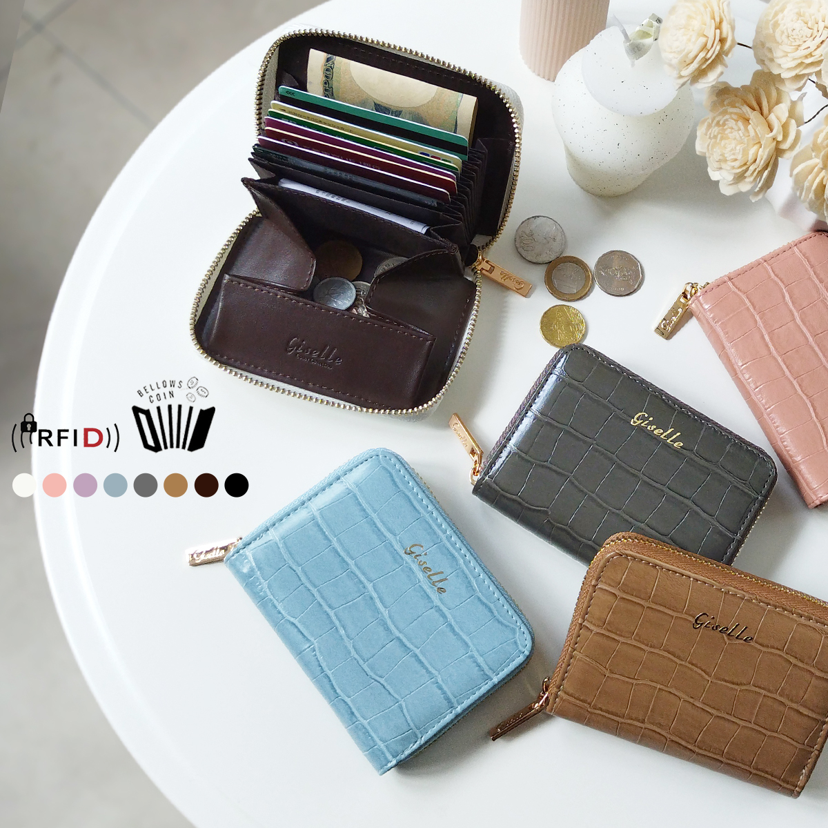 ミニ財布 レディース 二つ折り 大容量 お札折らない カードケース じゃばら 小銭入れ コンパクト クロコ風 ベローズ コインケース