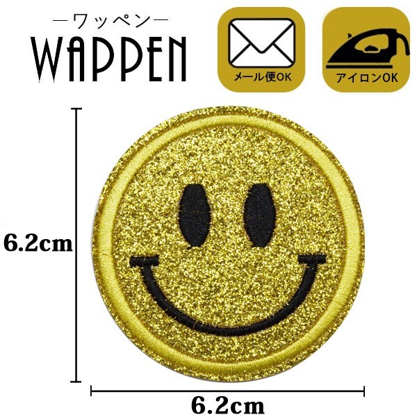 ワッペン 刺繍ワッペン アイロン接着 縦6.2cm×横6.2cm スマイル ニコちゃん イエロー キラキララメ アイロンワッペン アップリケ 手芸 メール便 爆買