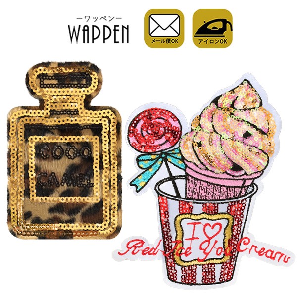 ワッペン スパンコール アイロン おしゃれ アップリケ ハンドメイド 香水 パフューム レオパード 豹柄 ソフトクリーム アイスクリーム メール便可