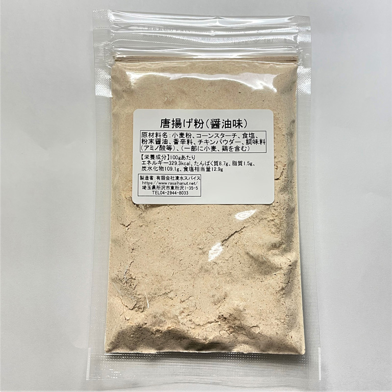 【原材料名】小麦粉(国内製造)、コーンスターチ、食塩、粉末醤油、香辛料、チキンパウダー/調味料(アミノ酸等)(一部に鶏肉・大豆を含む)