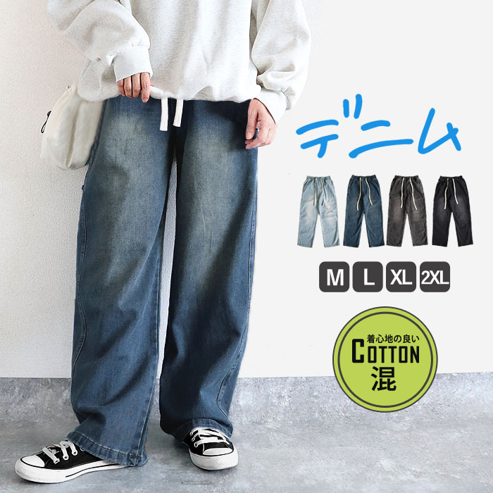 デニム ジーンズ パンツ ワイドパンツ レディース 春 夏 黒 おしゃれ ストレート ウエストゴム 大きいサイズ ロング イージーパンツ シンプル 40代 30代 50代 60代 ゆったり 大人 カジュアル かわいい きれいめ ポイント利用 SALE セール uricca ウリッカ うりっか