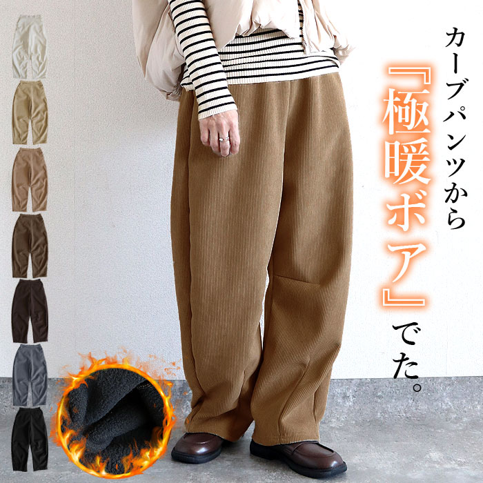 ボトムス レディース カーブパンツ 秋 冬 白 黒 おしゃれ 裏起毛 裏ボア 極暖 あったか 暖か ウエストゴム ウエスト紐付き バレルレッグパンツ コーデュロイ ポケット付 体型カバー シンプル 40代 30代 50代 60代 大きいサイズ ゆったり 大人 きれいめ カジュアル かわいい SALE セール uricca ウリッカ うりっか ポイント利用