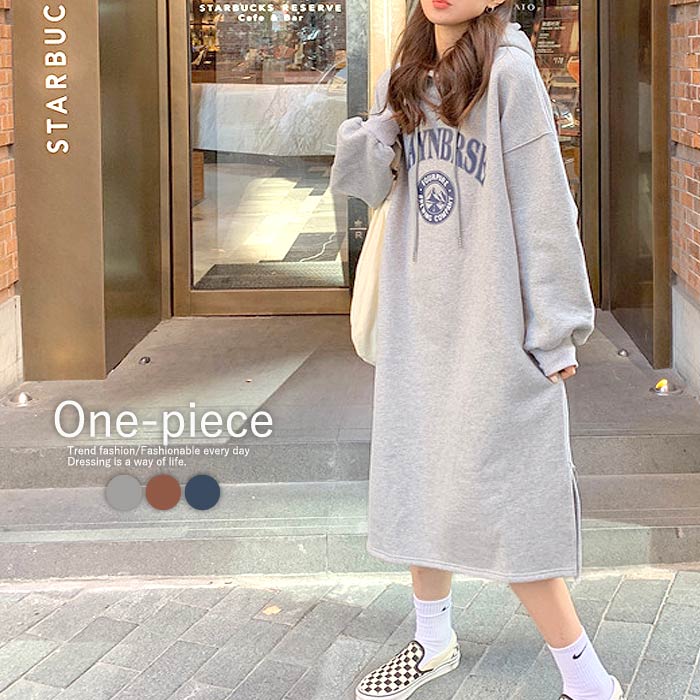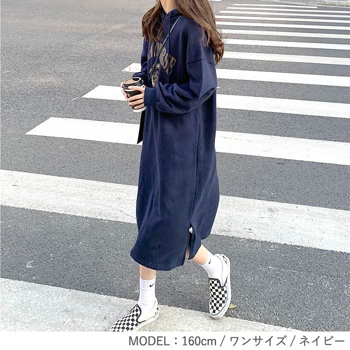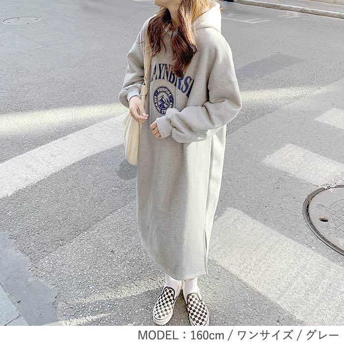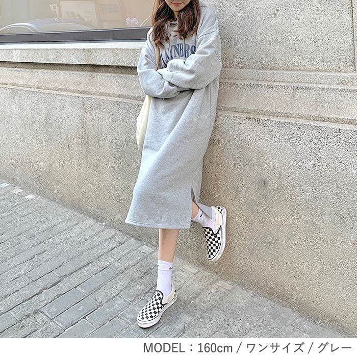 2691円 クーポンで! ワンピース ロング 裏起毛 レディース 長袖 秋 冬 おしゃれ かわいい スウェット パーカーワンピ カレッジロゴ 極暖 ^w672^