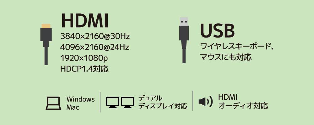 HDMIオーディオに対応 HDMI音声信号に対応しているので、スピーカー搭載のディスプレイであれば接続するだけで音声を出力することができます。 |
