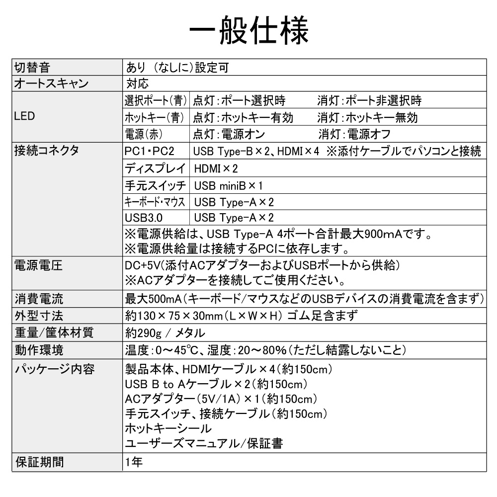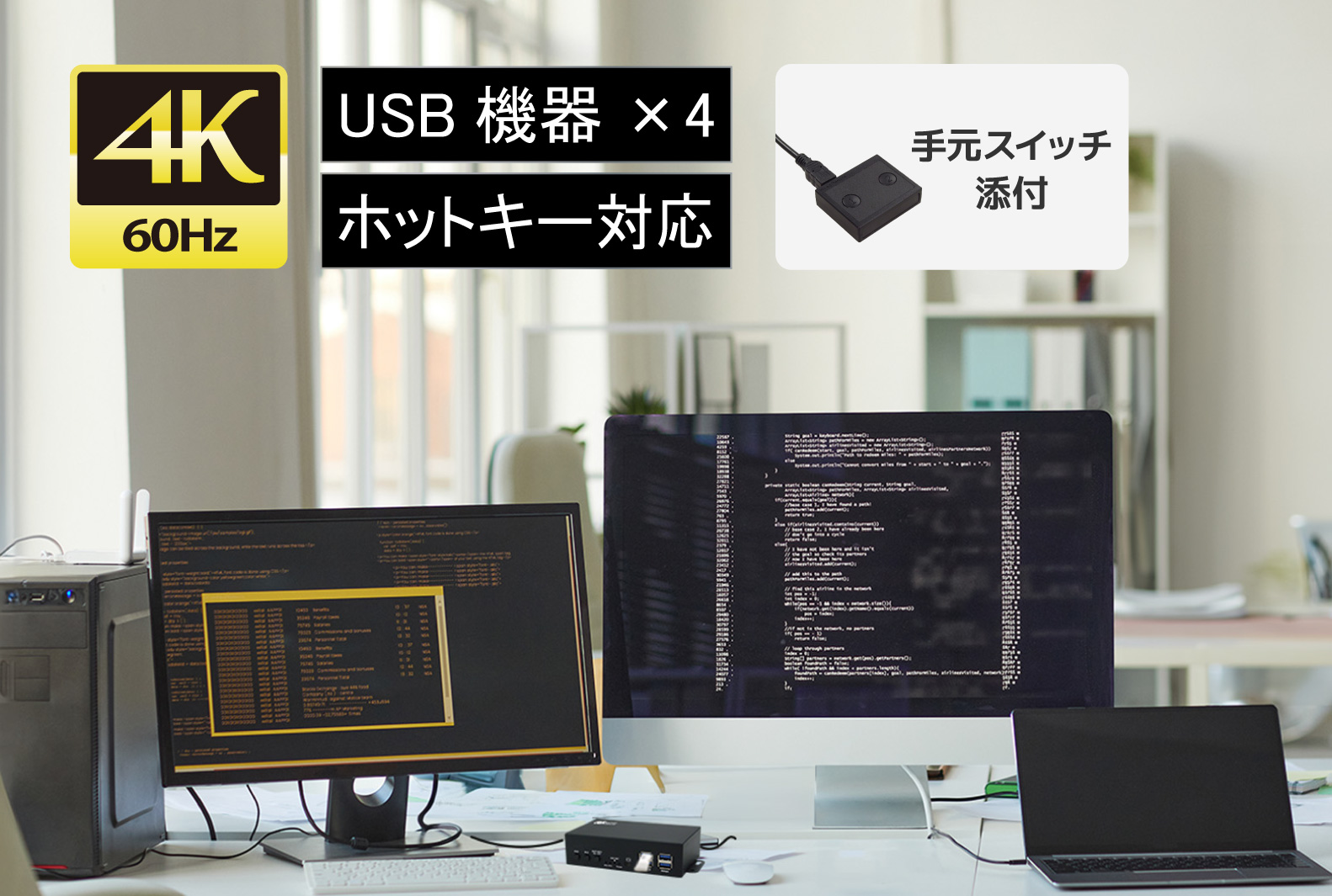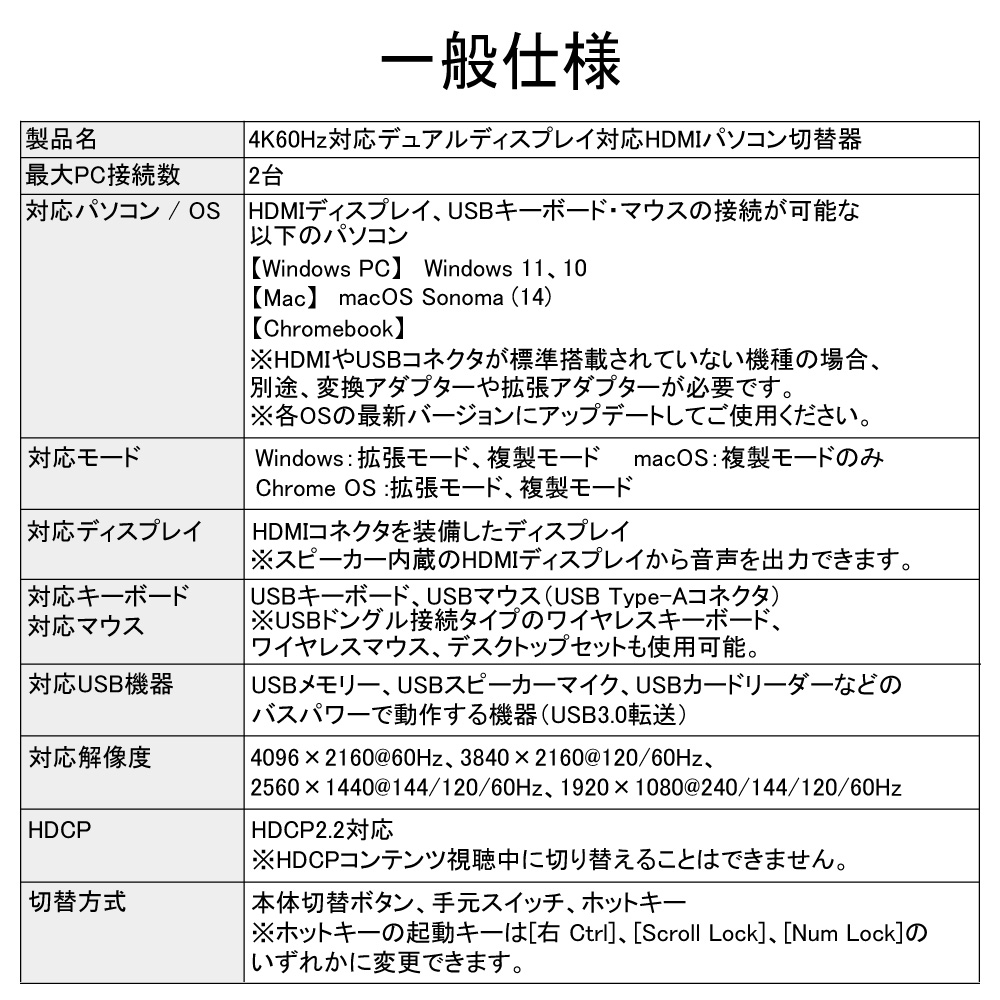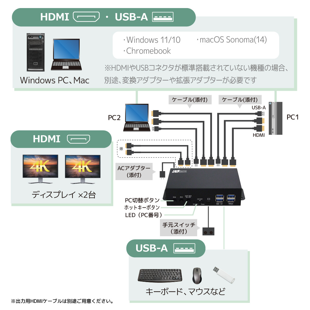 本製品は、HDMI端子とUSB Type-A端子が搭載されたパソコンに対応。 異なるOSのパソコン2台(Windows PC、Mac、Chromebook、Raspberry Pi)でも使用でき、ボタンひとつで切り替えることができます。