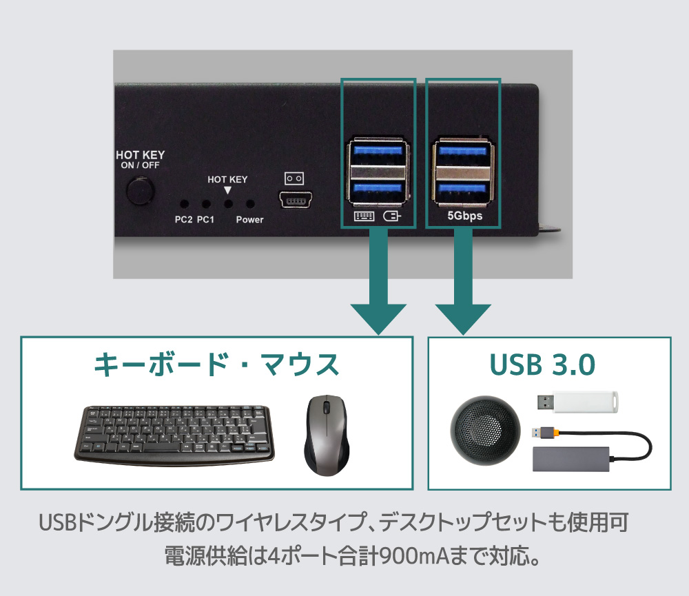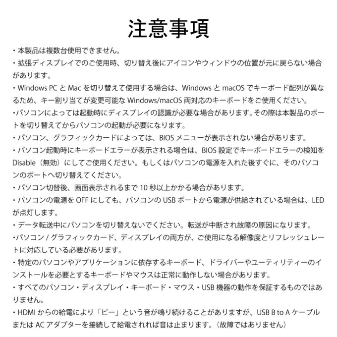 ※電源供給は4ポート合計900mAに対応。電源供給量は接続するPCに依存します。 ※データ転送中にパソコンを切り替えないでください。転送が中断され故障の原因になります。 ※切り替える前にパソコンで安全な取り外しを実行してください。