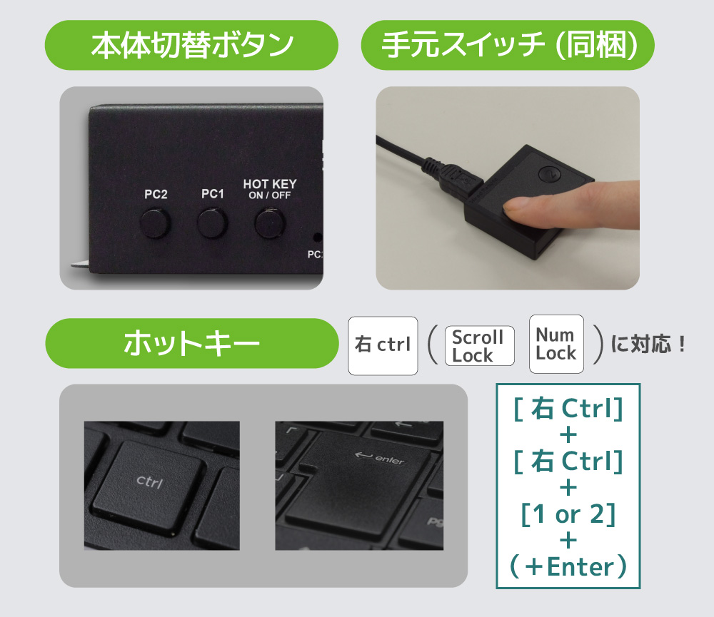 切替器本体に装備する切替ボタン、同梱の手元スイッチ、あるいはキーボード上の[右Ctrl]キーを2度押すホットキーによるパソコンの切替が可能です。