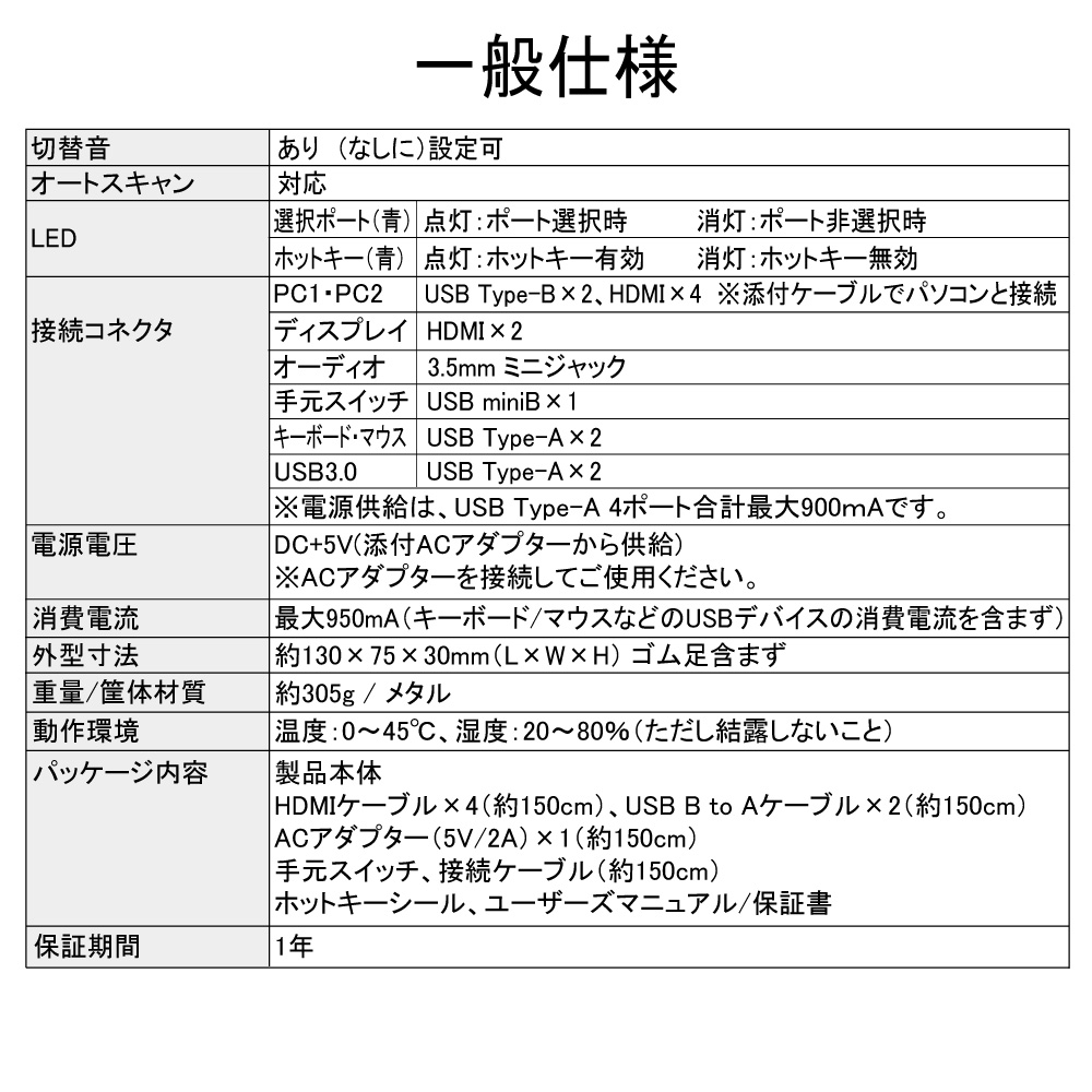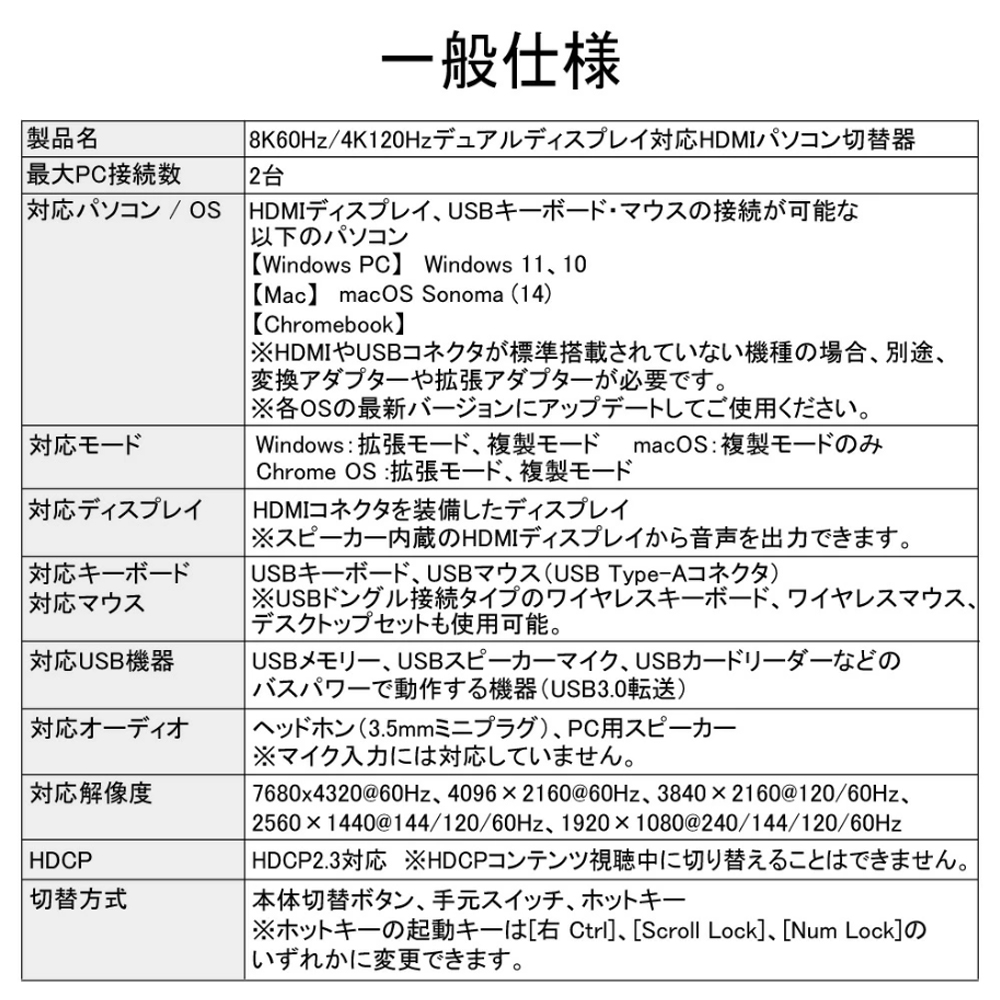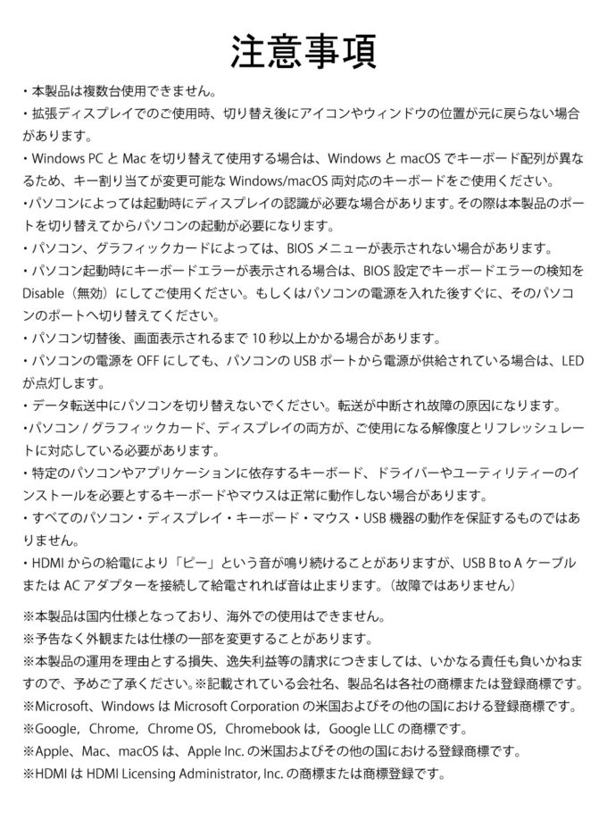 本製品は、HDMI端子とUSB Type-A端子が搭載されたパソコンに対応。 異なるOSのパソコン2台(Windows PC、Mac、Chromebook)でも使用でき、ボタンひとつで切り替えることができます。