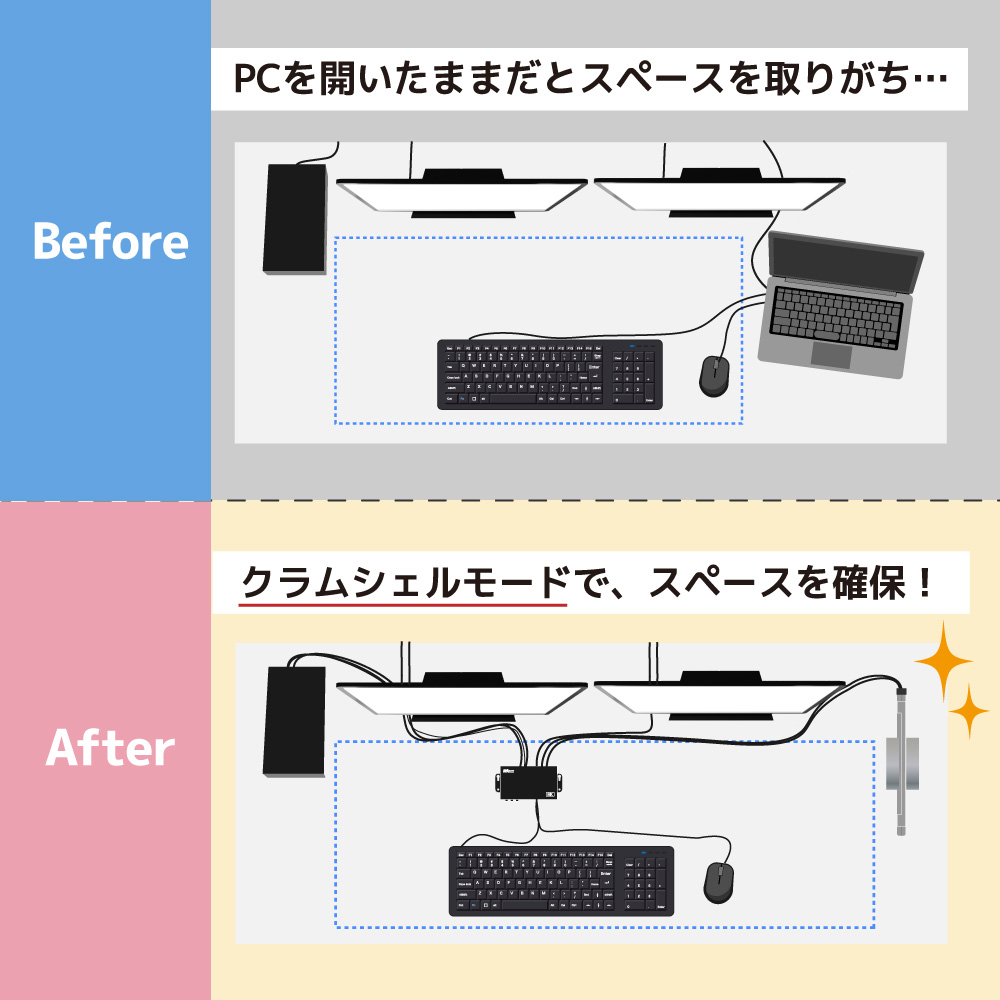 ノートパソコンを閉じたまま、作業スペースを確保したデスクトップ環境で作業をおこなえます。