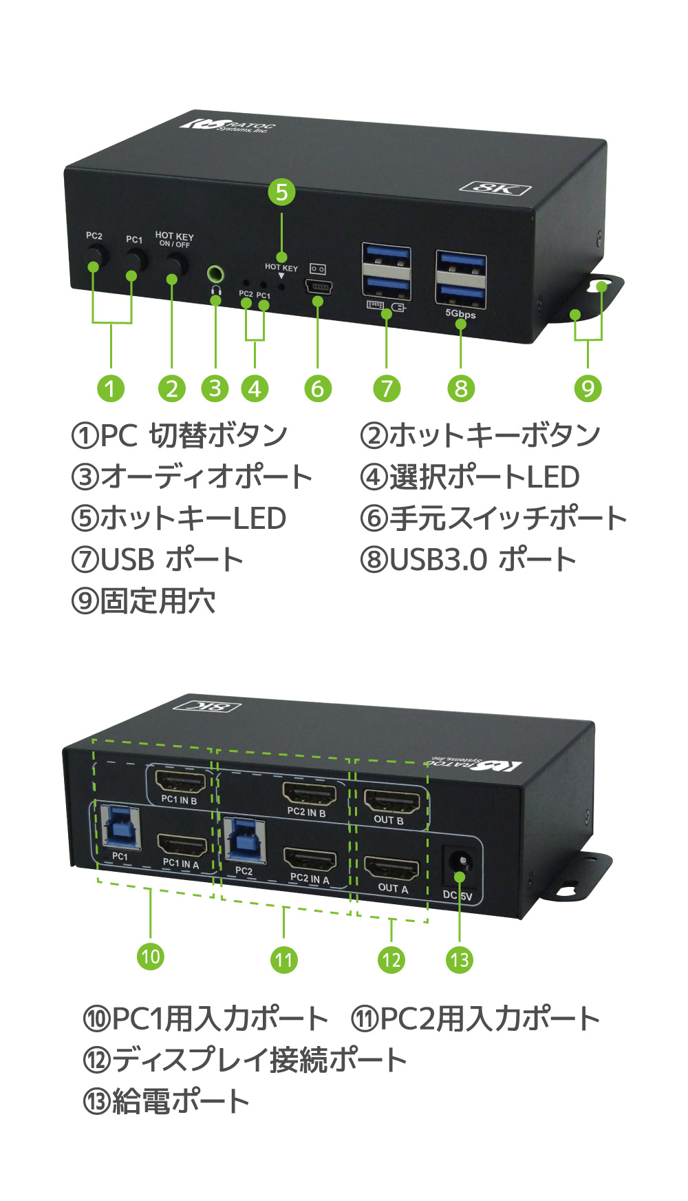 本製品上にLEDを搭載しており、LEDの点灯により選択中のパソコン番号やホットキーの有効が目視で確認できます。