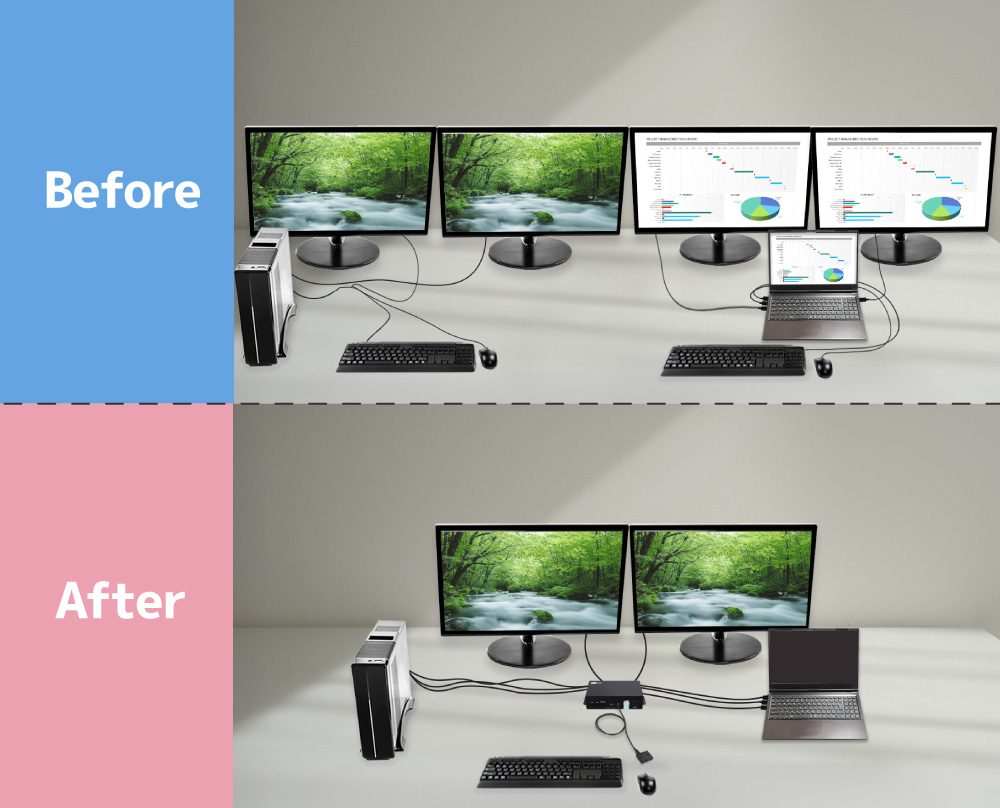 使い慣れたキーボードとマウスを複数台のパソコンで共有して、作業効率アップ。 それぞれのPCにディスプレイを用意する必要がないため、省スペースで、より広々とした操作環境が実現できます。