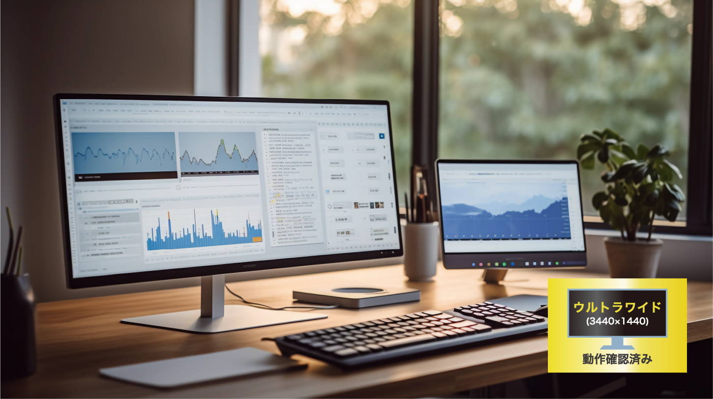 本製品は、ウルトラワイドモニターUWQHD (3440×1440)での動作を確認しています。 ウルトラワイドモニターは1台で広々と使えるため、作業の効率化、デスクの省スペース化にもおすすめです。