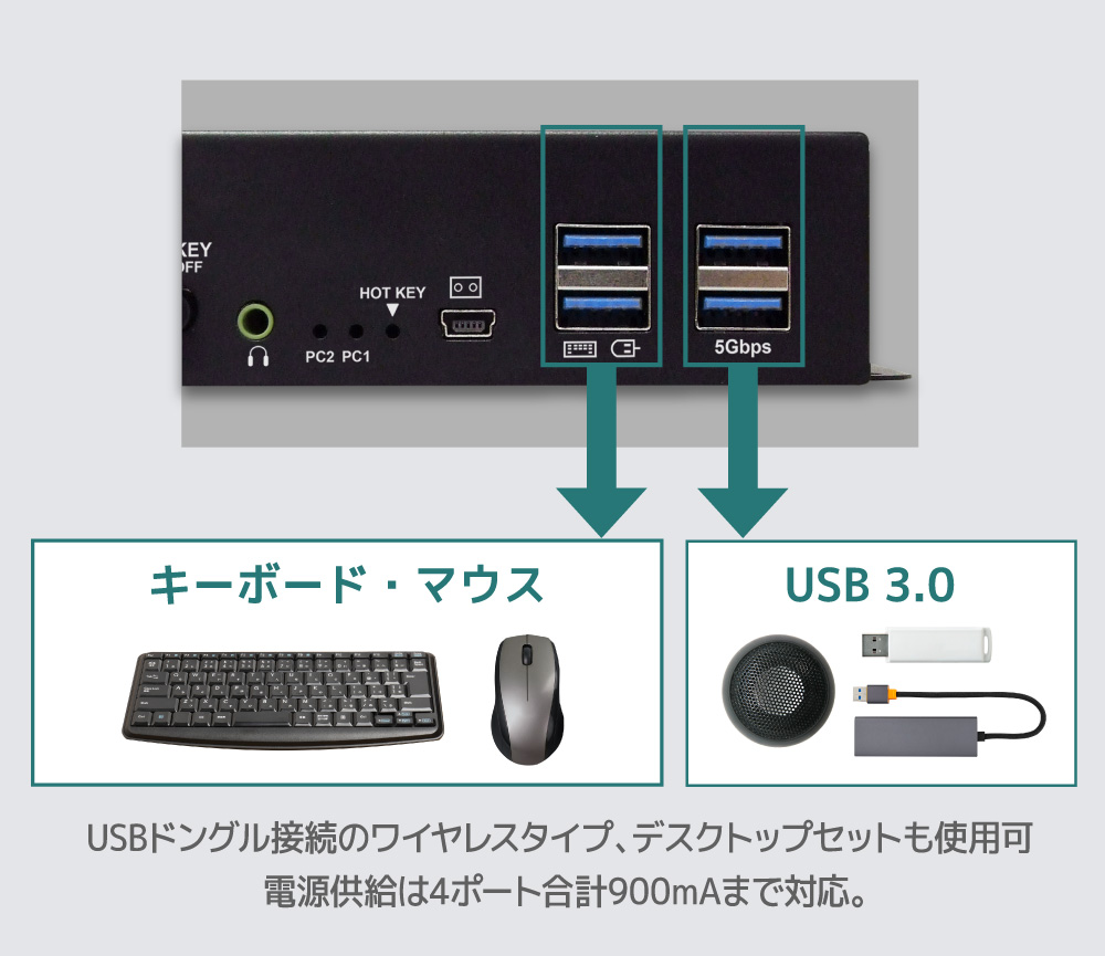 ※電源供給は、USB Type-A 4ポート合計最大900mAです。 ※データ転送中にパソコンを切り替えないでください。転送が中断され故障の原因になります。 ※切り替える前にパソコンで安全な取り外しを実行してください。