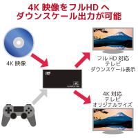 | 4K映像をフルHDへダウンスケール出力が可能 4K映像入力時に、接続された2つのテレビ・ディスプレイの解像度が異なる場合でも、それぞれの解像度に合わせて表示することのできる"ダウンスケール機能"が搭載されています。 | ||||||||||||||||||||